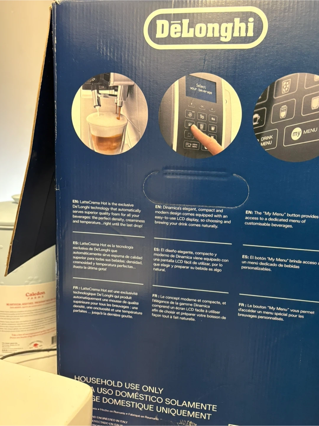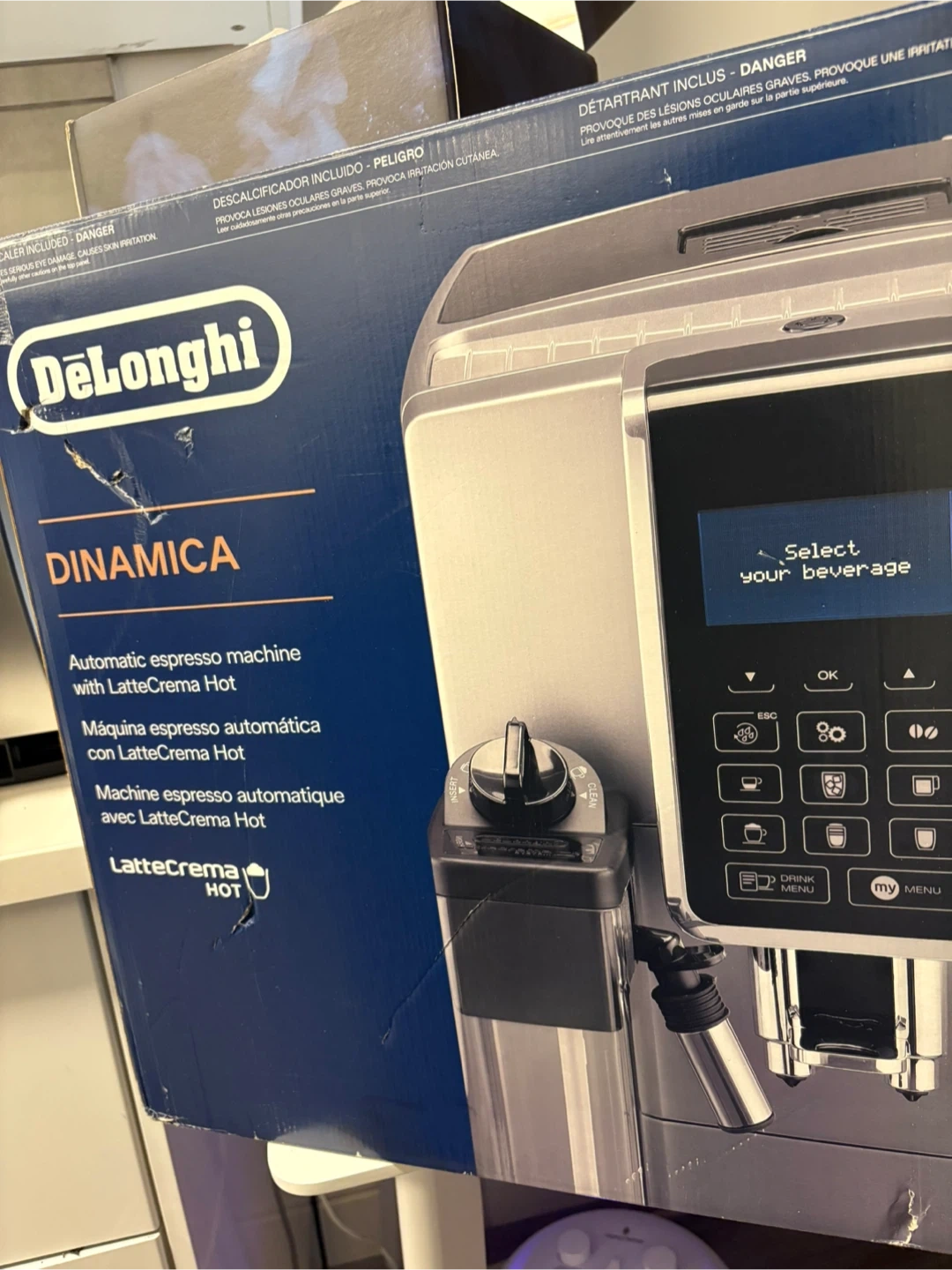 Selling a DeLonghi Dinamica automatic espresso machine! It's in great condition and comes with the box. This machine is equipped with an easy-to-use LCD display, making brewing your drink come naturally. It also features LatteCrema Hot technology for perfect foam for all your beverages. Used once