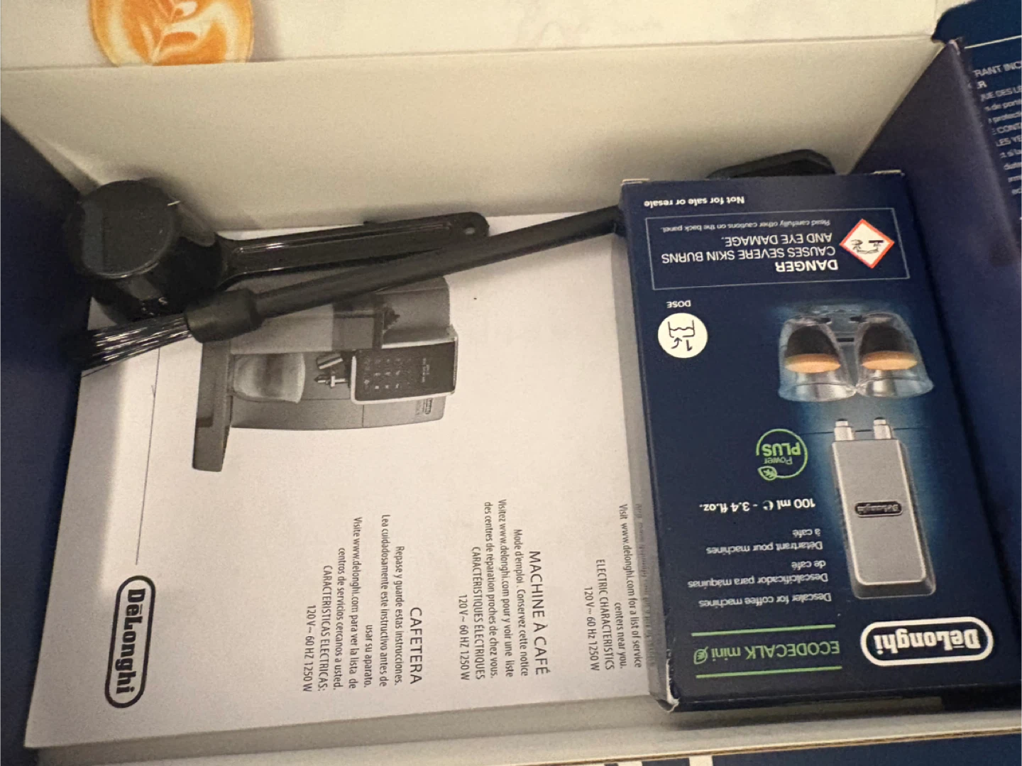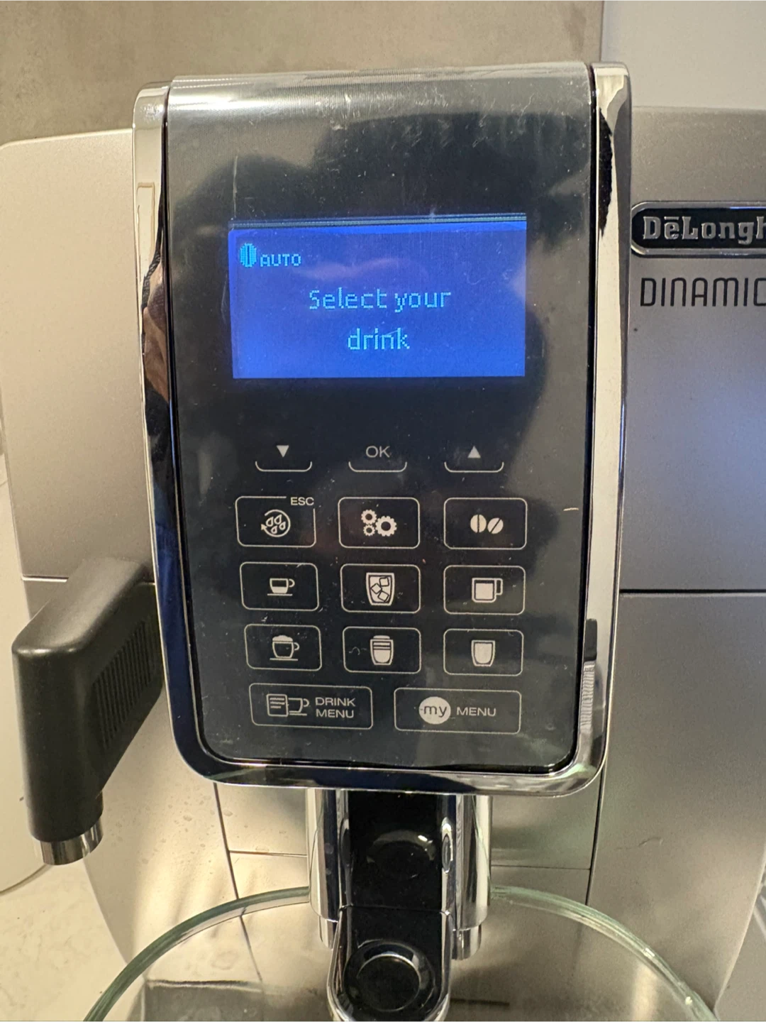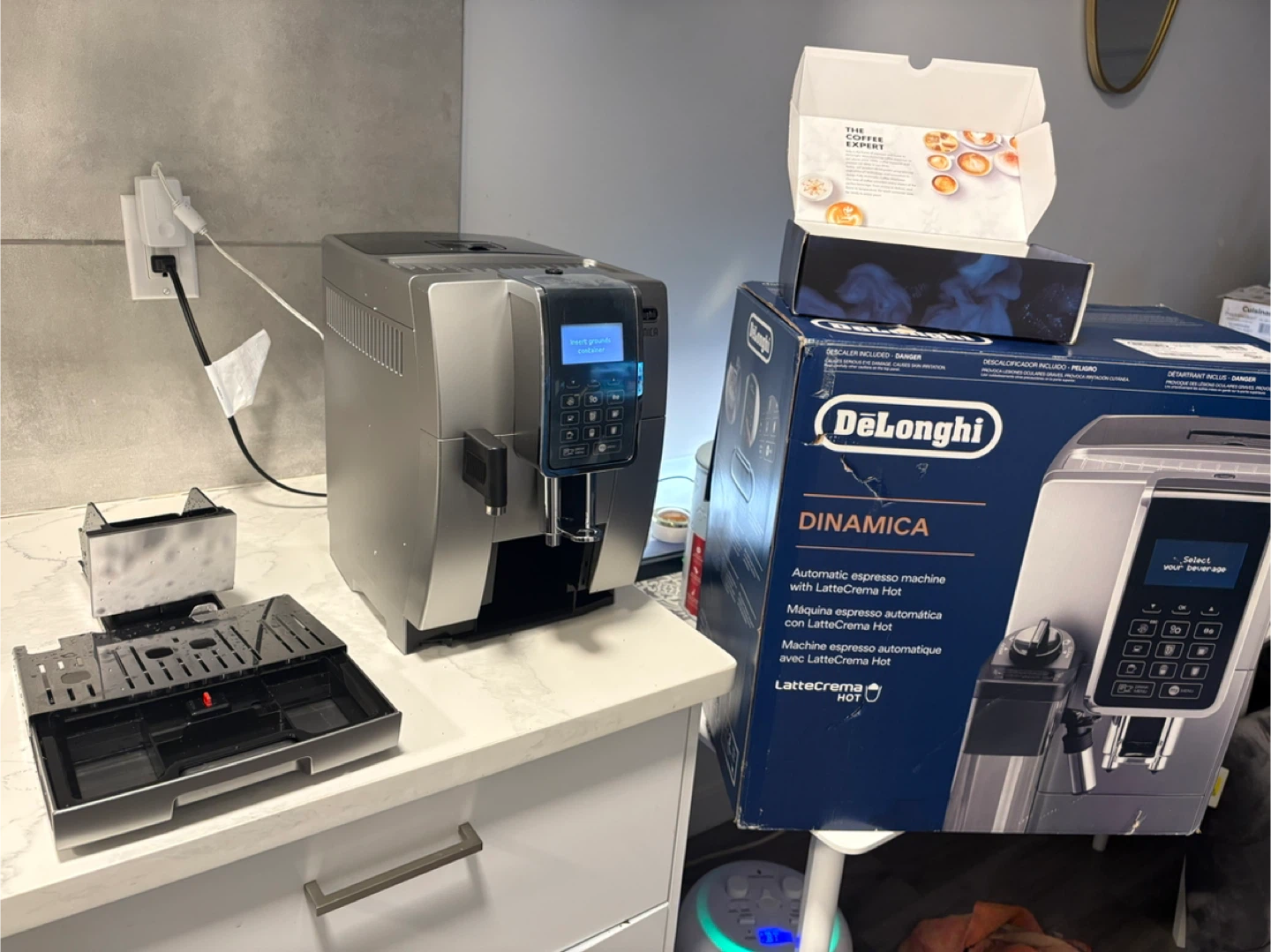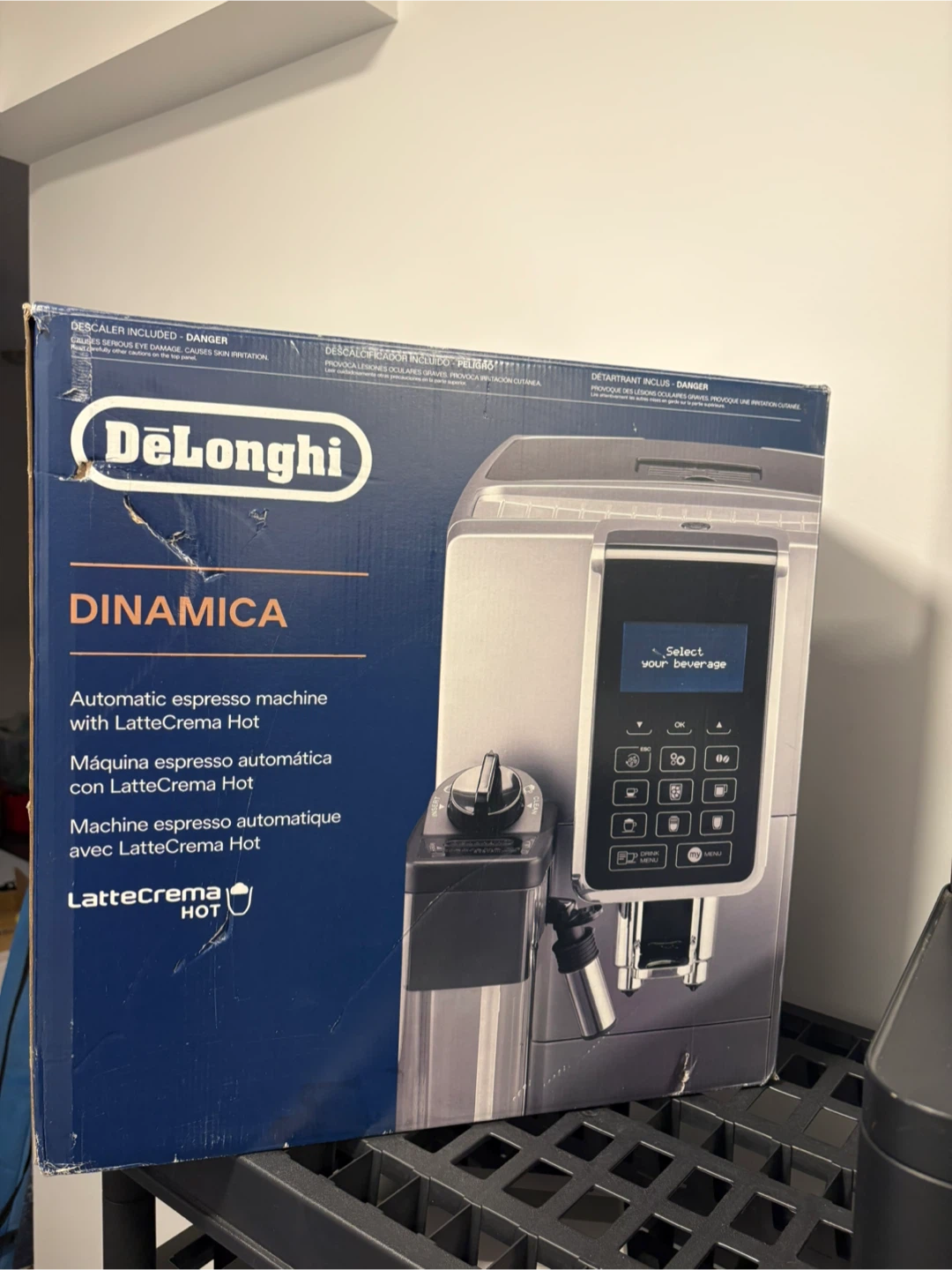 Selling a DeLonghi Dinamica automatic espresso machine! It's in great condition and comes with the box. This machine is equipped with an easy-to-use LCD display, making brewing your drink come naturally. It also features LatteCrema Hot technology for perfect foam for all your beverages. Used once