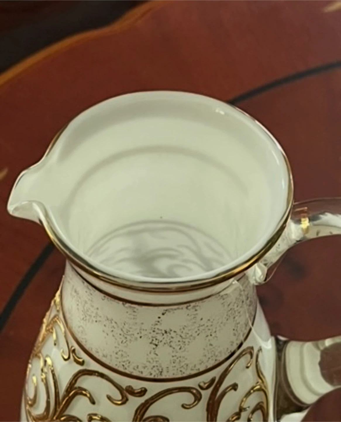 Selling a lovely vintage glass pitcher! It features a beautiful white and gold design, perfect for adding a touch of elegance to your table setting. The pitcher is in great condition and ready to be used for serving your favourite beverages