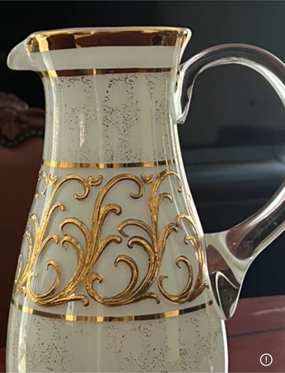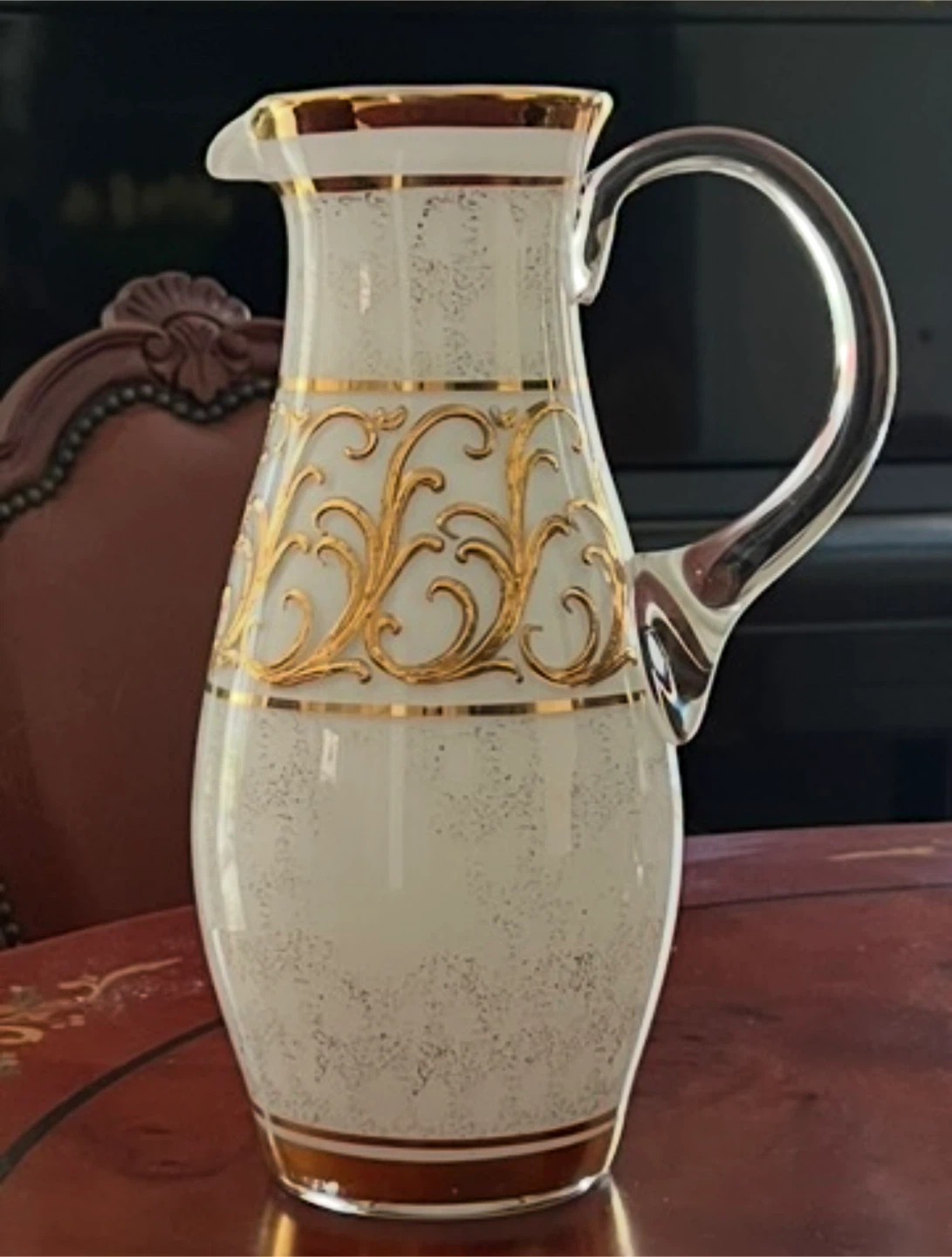 Selling a lovely vintage glass pitcher! It features a beautiful white and gold design, perfect for adding a touch of elegance to your table setting. The pitcher is in great condition and ready to be used for serving your favourite beverages