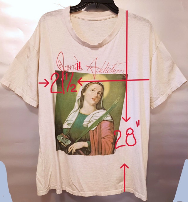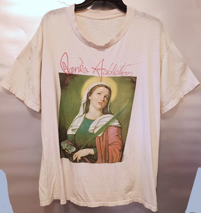 This vintage Jane's Addiction "Ritual De Lo Habitual" shirt featuring St. Lucy is authentic, not a modern re-print. I've owned it for over 20 years, and it was given to me by a friend who had it for years before that. The size is estimated at LG-XL (measurements shown in photo).The neck is stretched out and there are a few small holes, as shown in the photos. The tag is gone, but the Brockum copyright is still visible on the front. No shipping. Lowballers and re-sellers please note that I'm not going to be haggling on this one. No shipping. Available for a safe, public meet-up in downtown Kitchener.