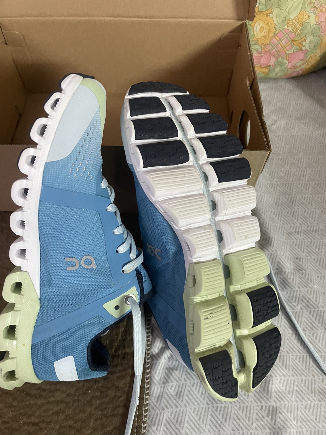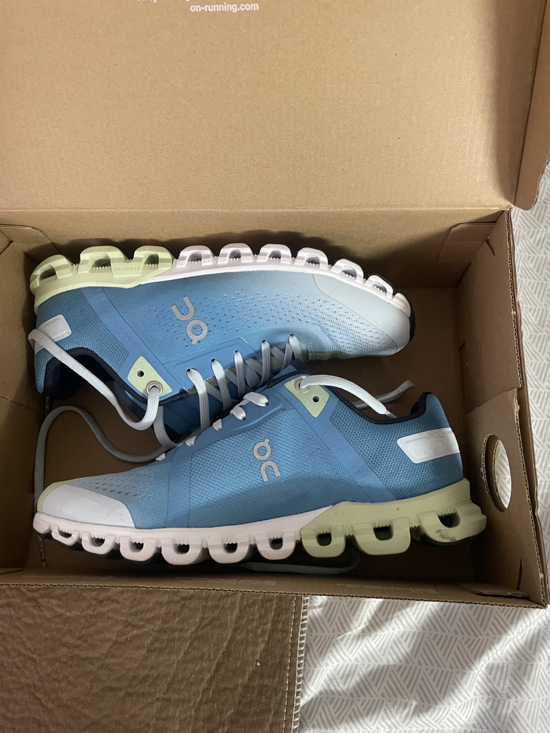 On Cloudflow running shoes. Women's size 6. Light blue colour. New in box. Niagara | Meadow colourway.pick up Markham and Lawrence