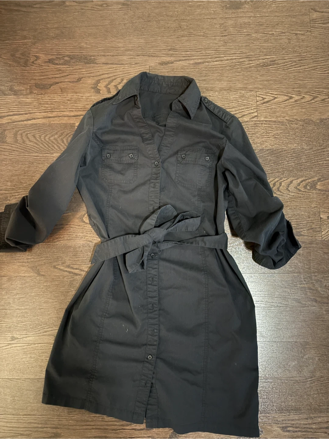 This is a black shirtdress with a button-up front. It features two chest pockets and a tie belt. The sleeves can be rolled up. Material appears to be cotton or a cotton blend.