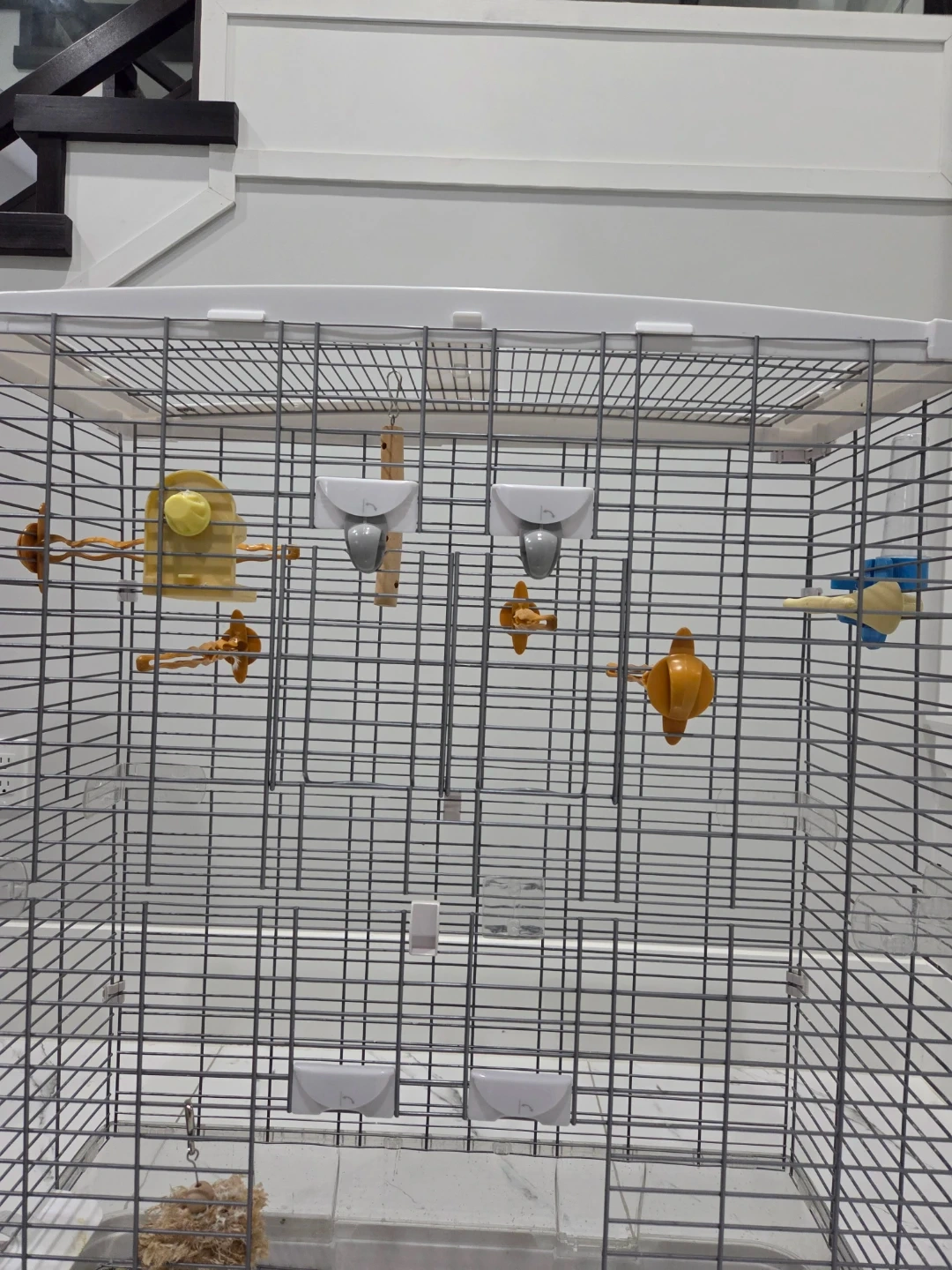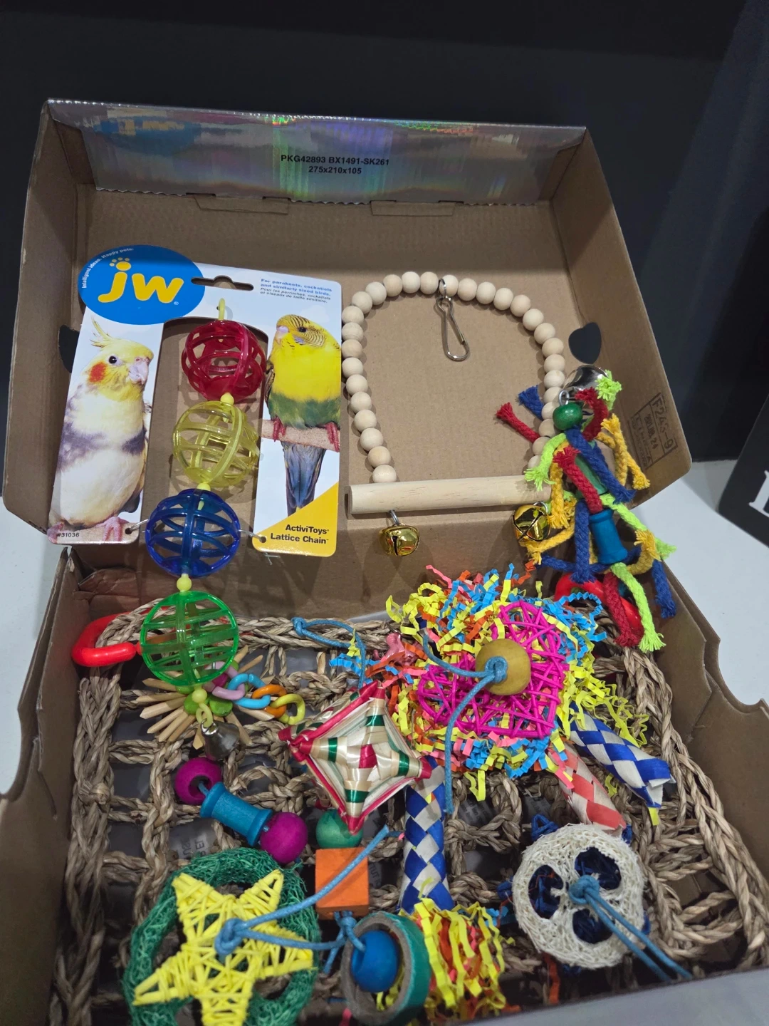 This is a box of assorted bird toys for small to medium-sized birds. It includes a wooden swing, a lattice chain toy, and various other chewable and dangly toys made from wood, rope, and plastic. These toys provide enrichment and chewing opportunities for your pet.