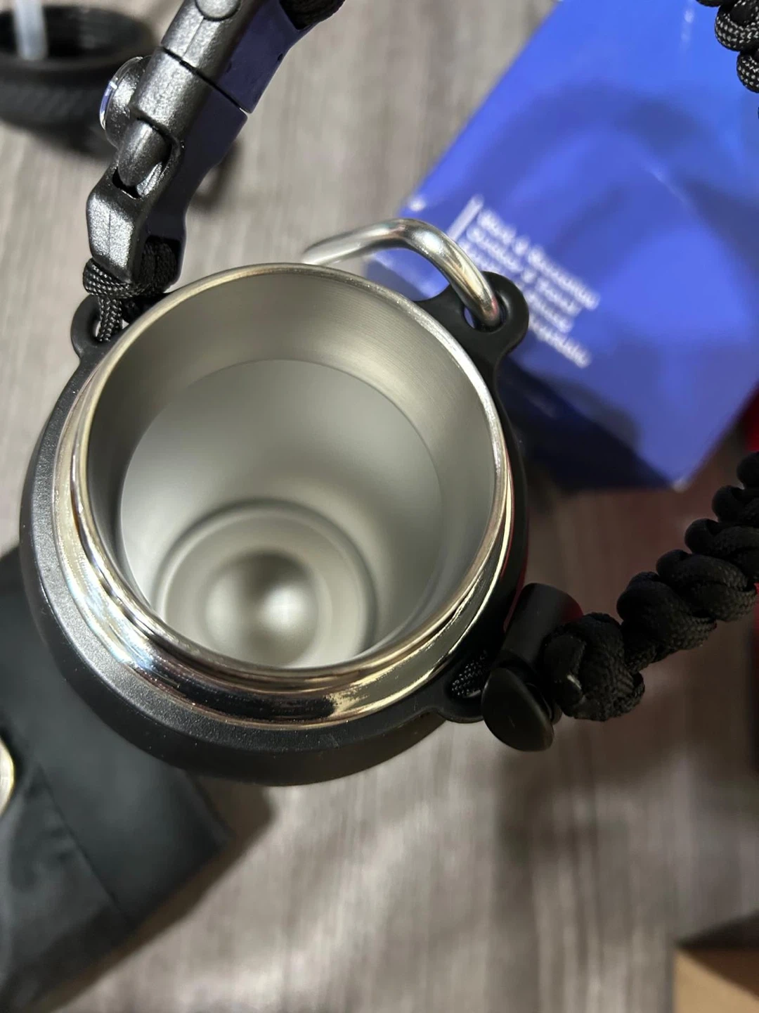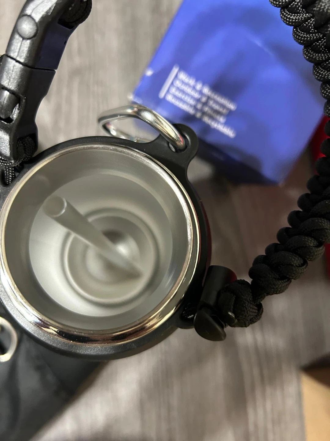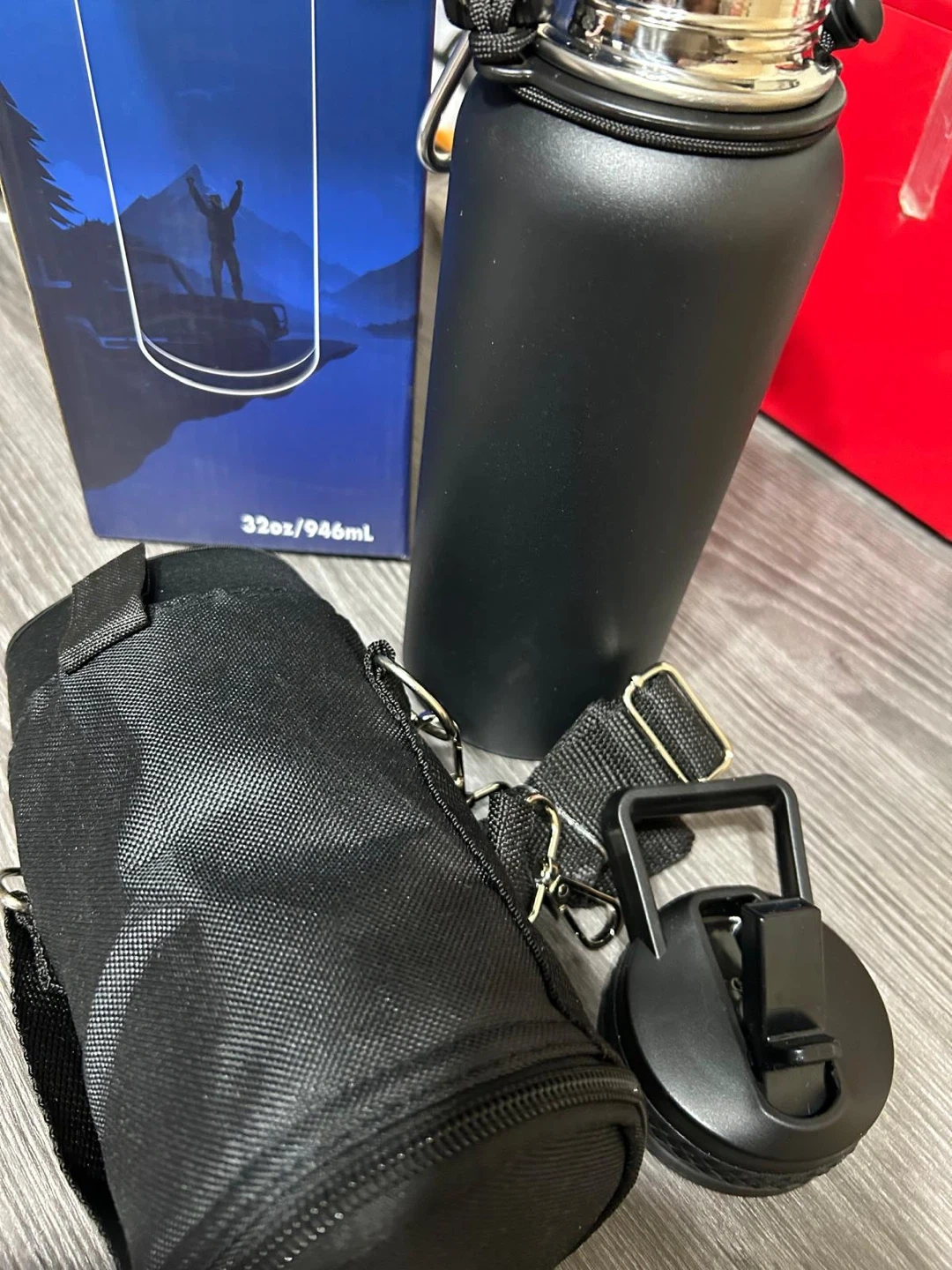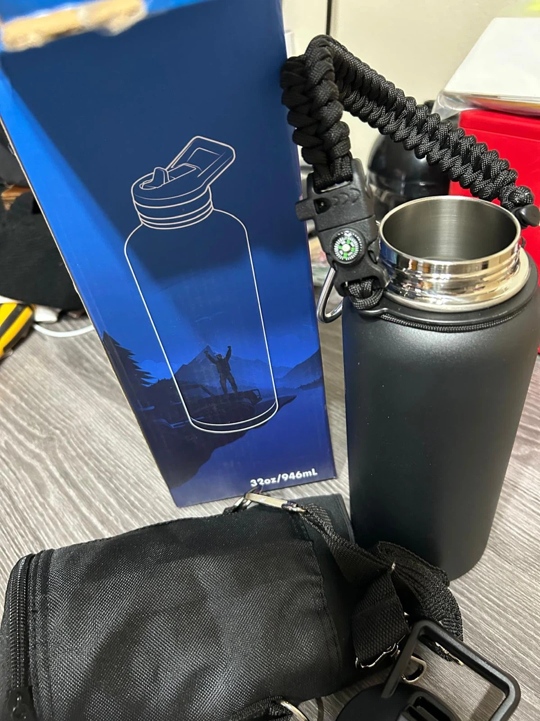 This RAYMYLO insulated water bottle is 40 oz and made of stainless steel. It's black with a paracord handle and straw spout lid. It's great for keeping drinks cold for up to 48 hours!
