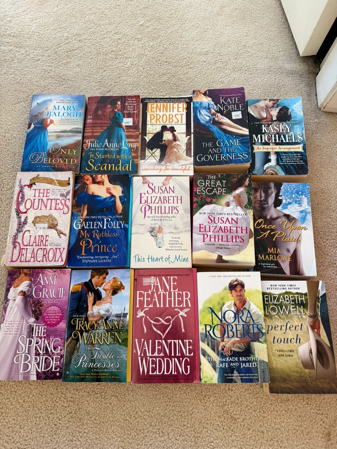 Group 1 - A collection of 15 romance novels by various New York Times bestselling authors. Includes titles from Mary Balogh, Julie Anne Long, Jennifer Probst, Kate Noble, Kasey Michaels, Claire Delacroix, Gaelen Foley, Susan Elizabeth Phillips, Mia Marlowe, Anne Gracie, Tracy Anne Warren, Jane Feather, Nora Roberts, and Elizabeth Lowell. Books are in good condition, perfect for any romance reader!