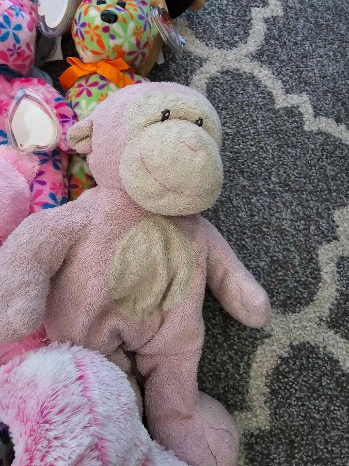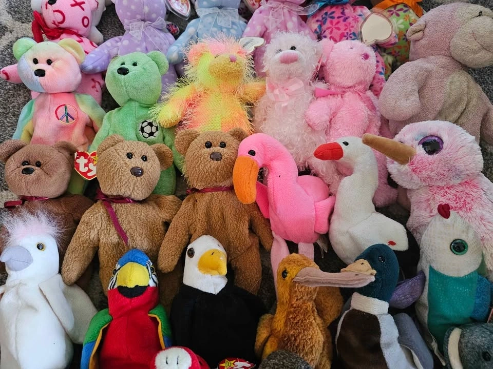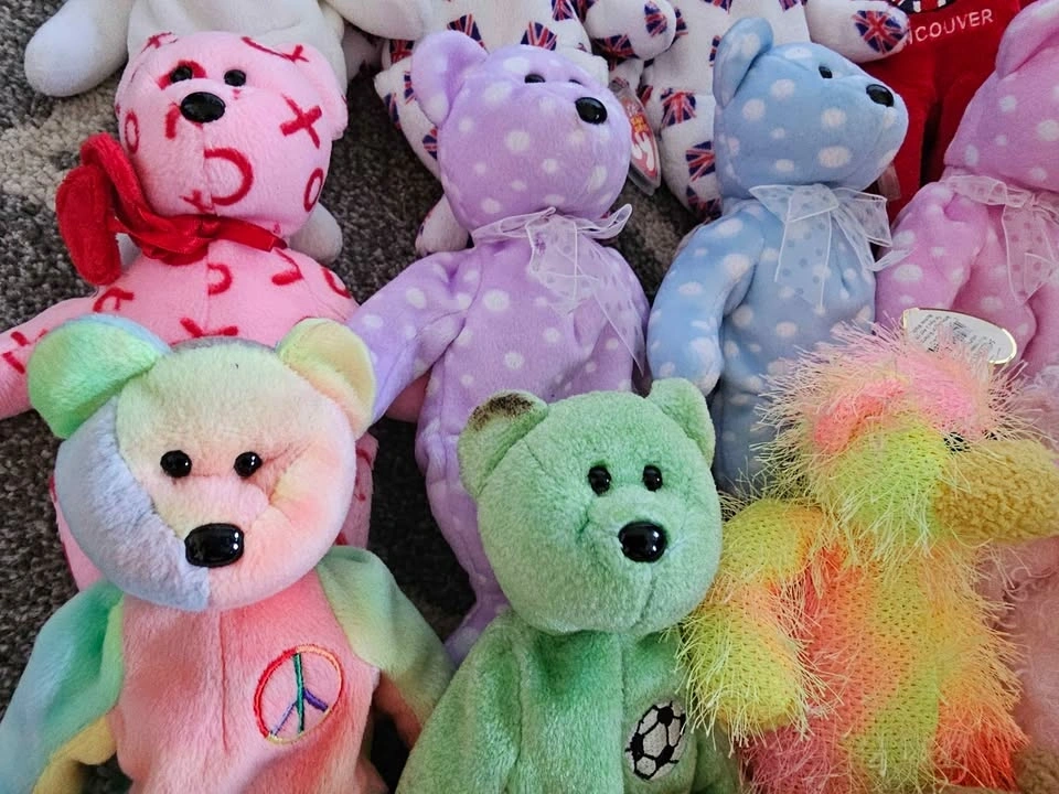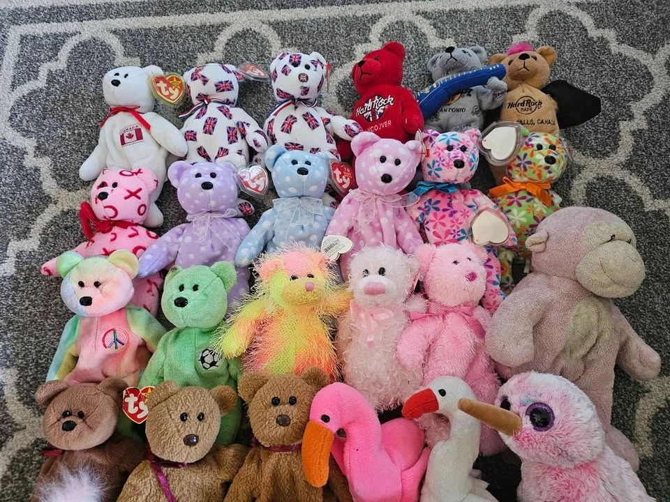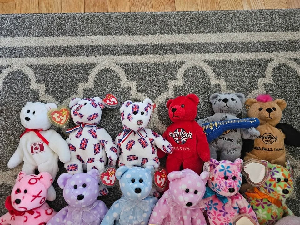 Selling a large collection of 40 plush collectibles. Perfect for a collector looking to fill gaps or for a reseller. Highlights include: Hard Rock Cafe Bears: Limited edition city bears from Vancouver, San Antonio, and Niagara Falls. International Ty Bears: Maple (Canada), 2x Britannia (UK), and the 10th Anniversary Decade bear. Classic Animals: Peace (Tie-dye), Kicks (Soccer), Pinky (Flamingo), Jabber (Parrot), Jake (Duck), and many more zoo/safari animals. Bonus: Includes one large Beanie Buddy (Pink Monkey). Most are in "like new" condition with tags attached. A few in the lot have minor staining/wear and are priced accordingly as part of the bundle. Kicks has a stain his ear, the Valentine's Day bear has a stain on the front, and the larger Beanie Buddy is well loved (see photos). Selling as a lot. Potentially open to selling individual items.