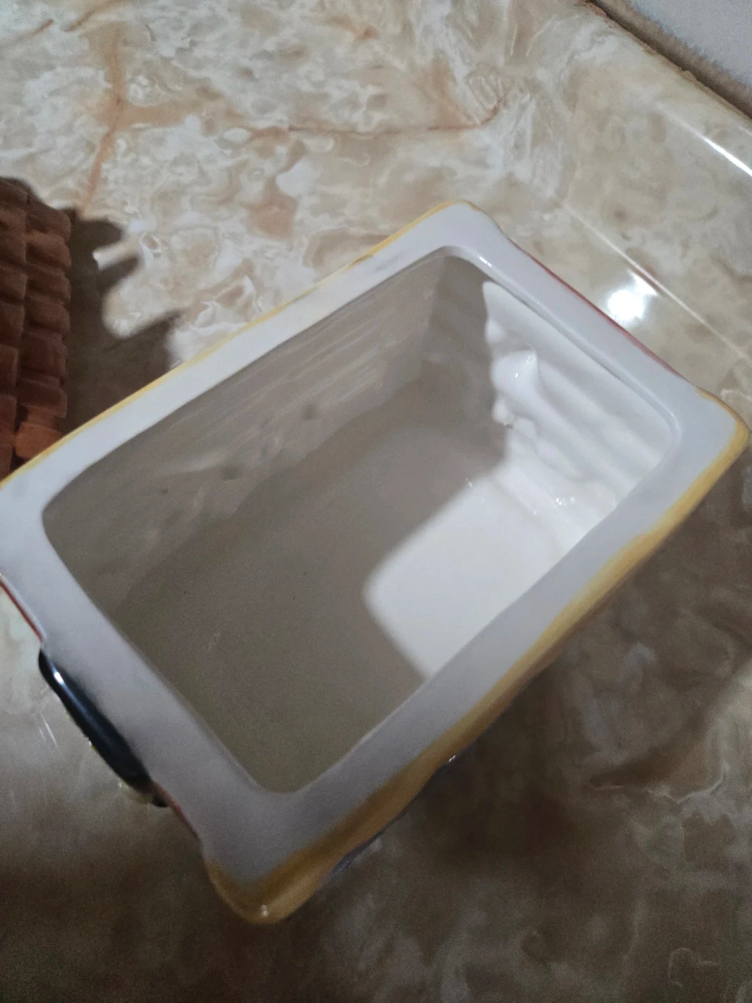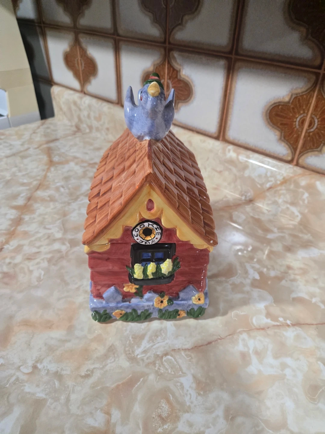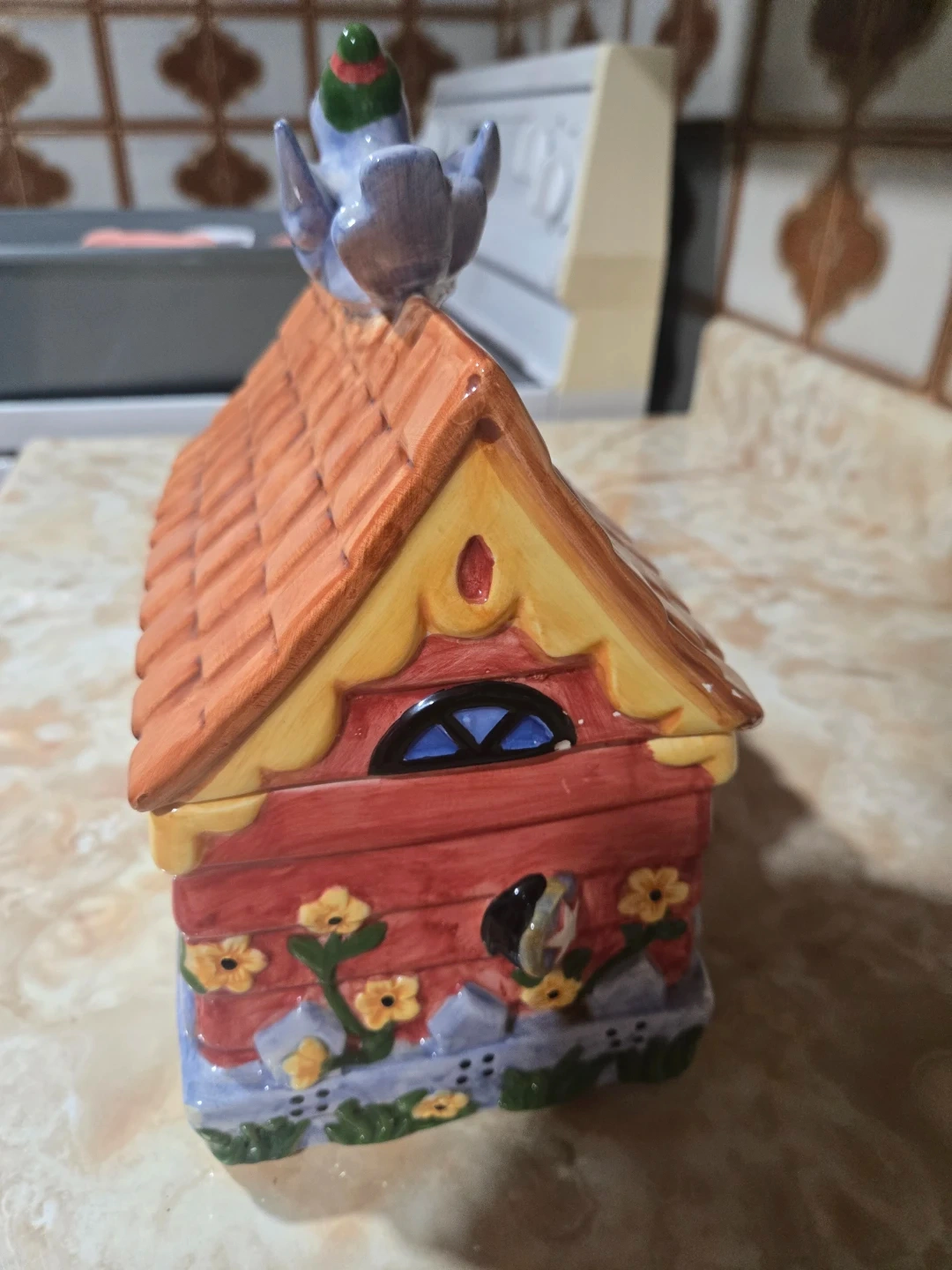 This charming ceramic cookie jar is shaped like a colourful little house, complete with a bird on the roof.