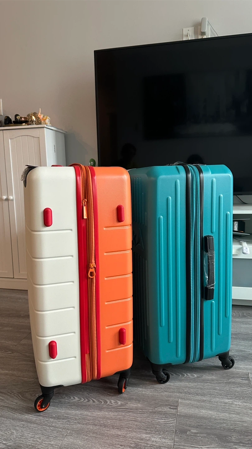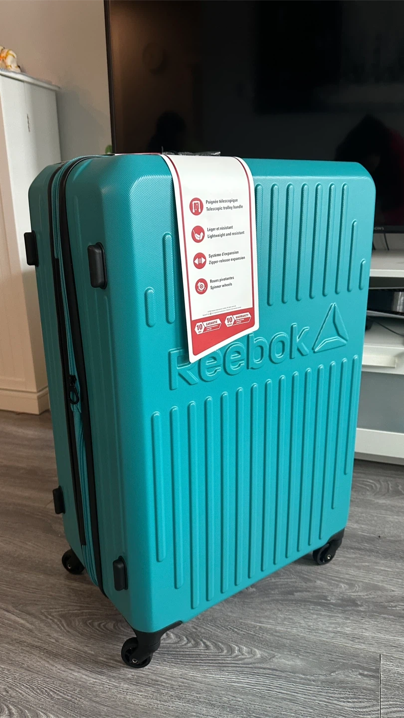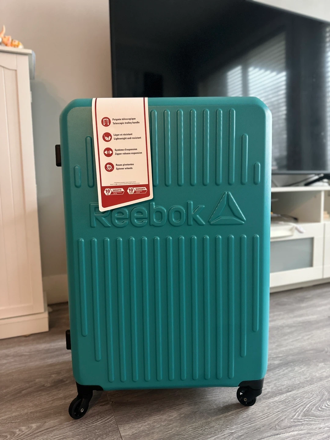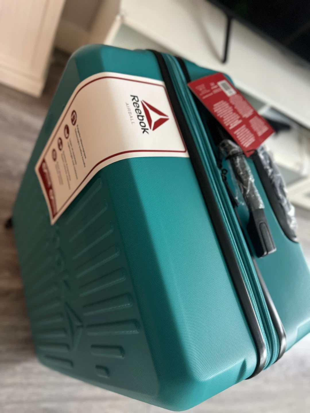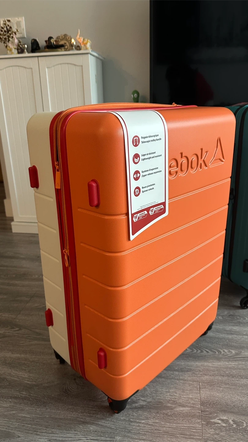 This set includes two Reebok suitcases, one orange and white, and one teal. They're designed to be lightweight and durable. Both feature smooth-rolling spinner wheels.