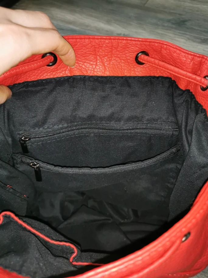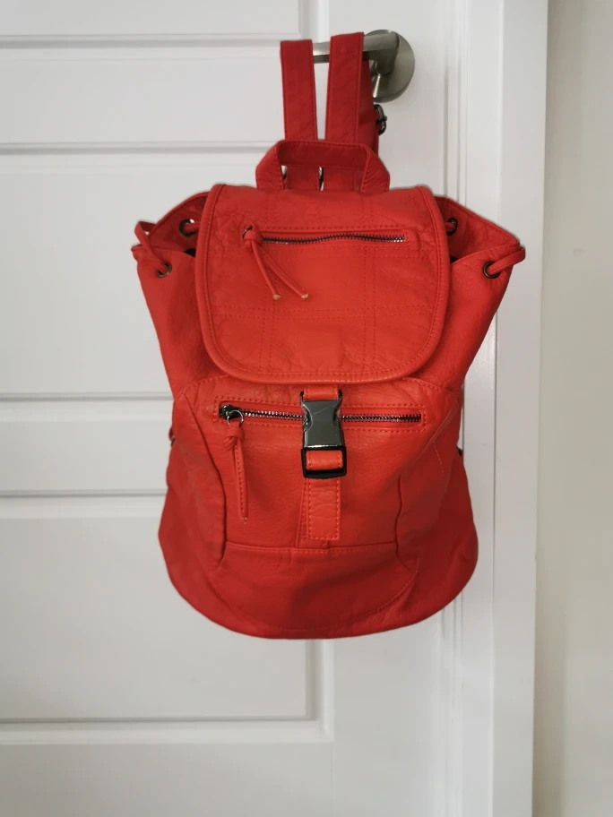Stylish red backpack. Features drawstring closure, multiple zippered pockets, and adjustable straps. Great for everyday use.