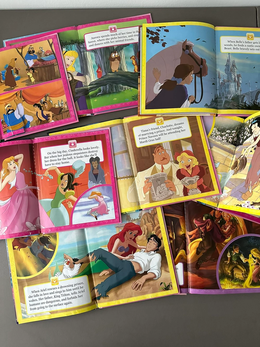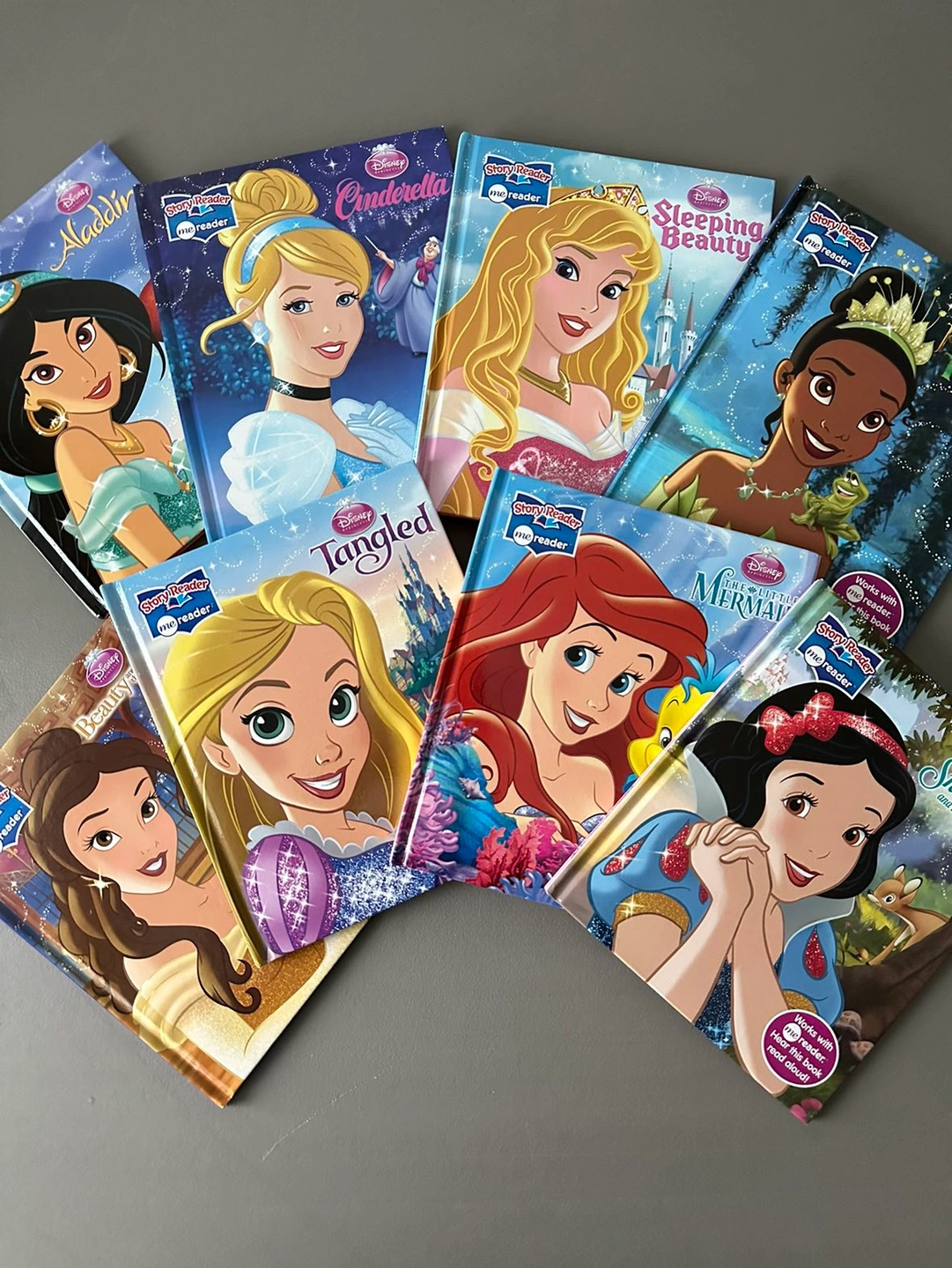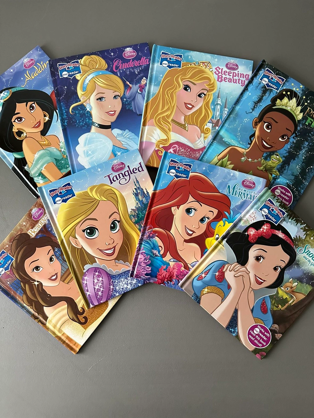 Disney Princess collection books featuring Jasmine, Sleeping Beauty, Belle, Ariel, Cinderella, Tiana, Snow White and Rupunzel.