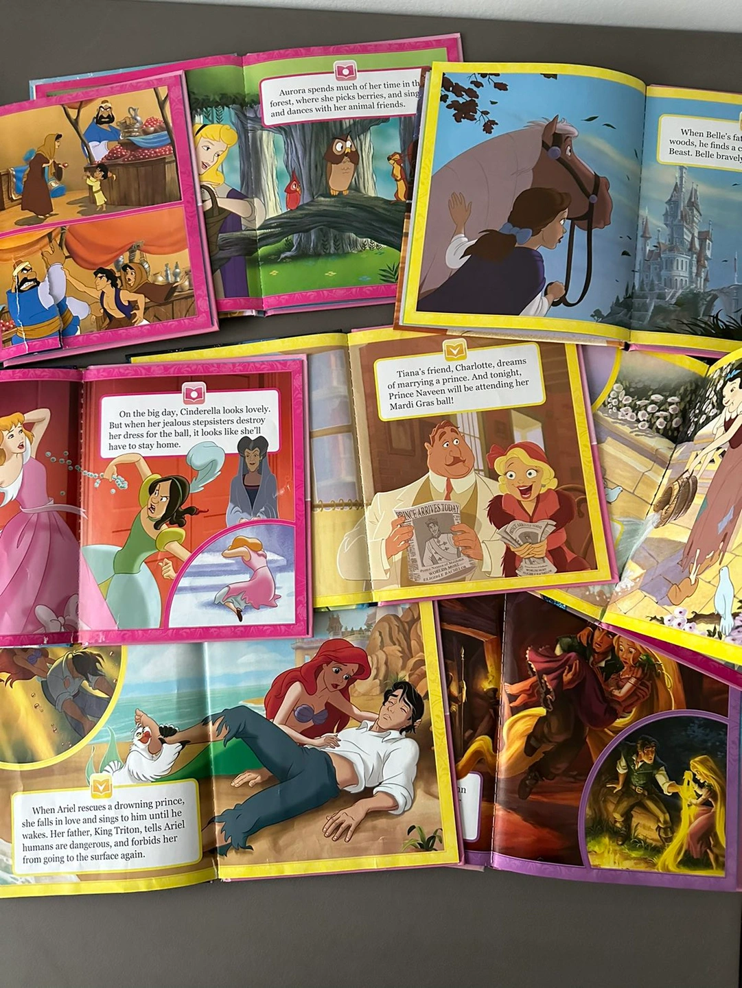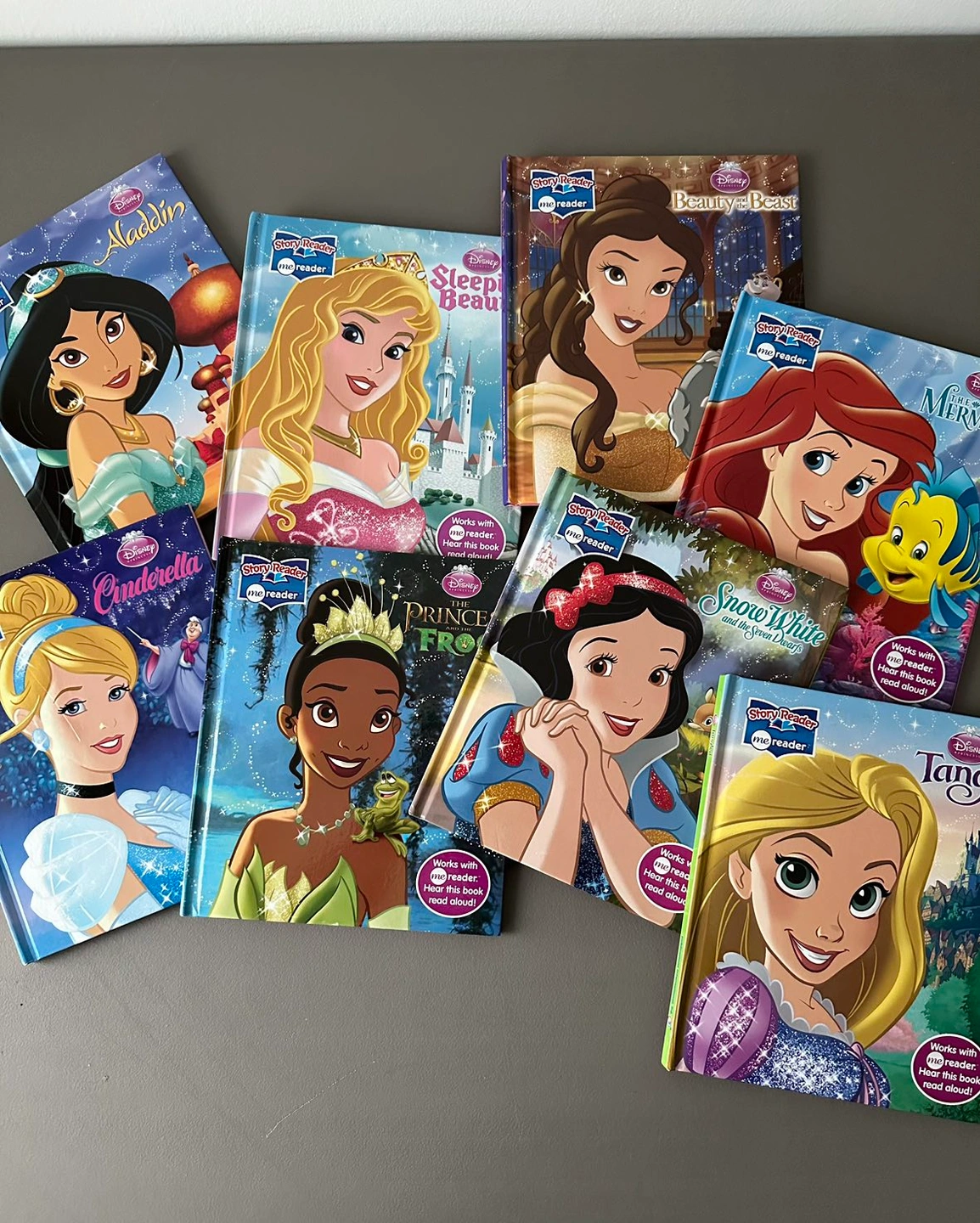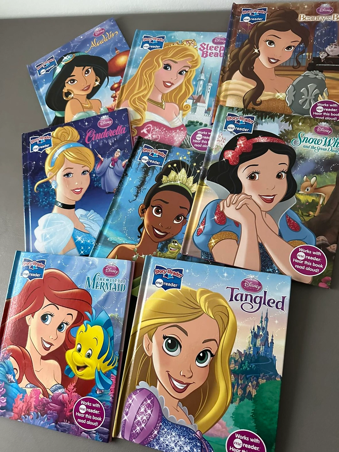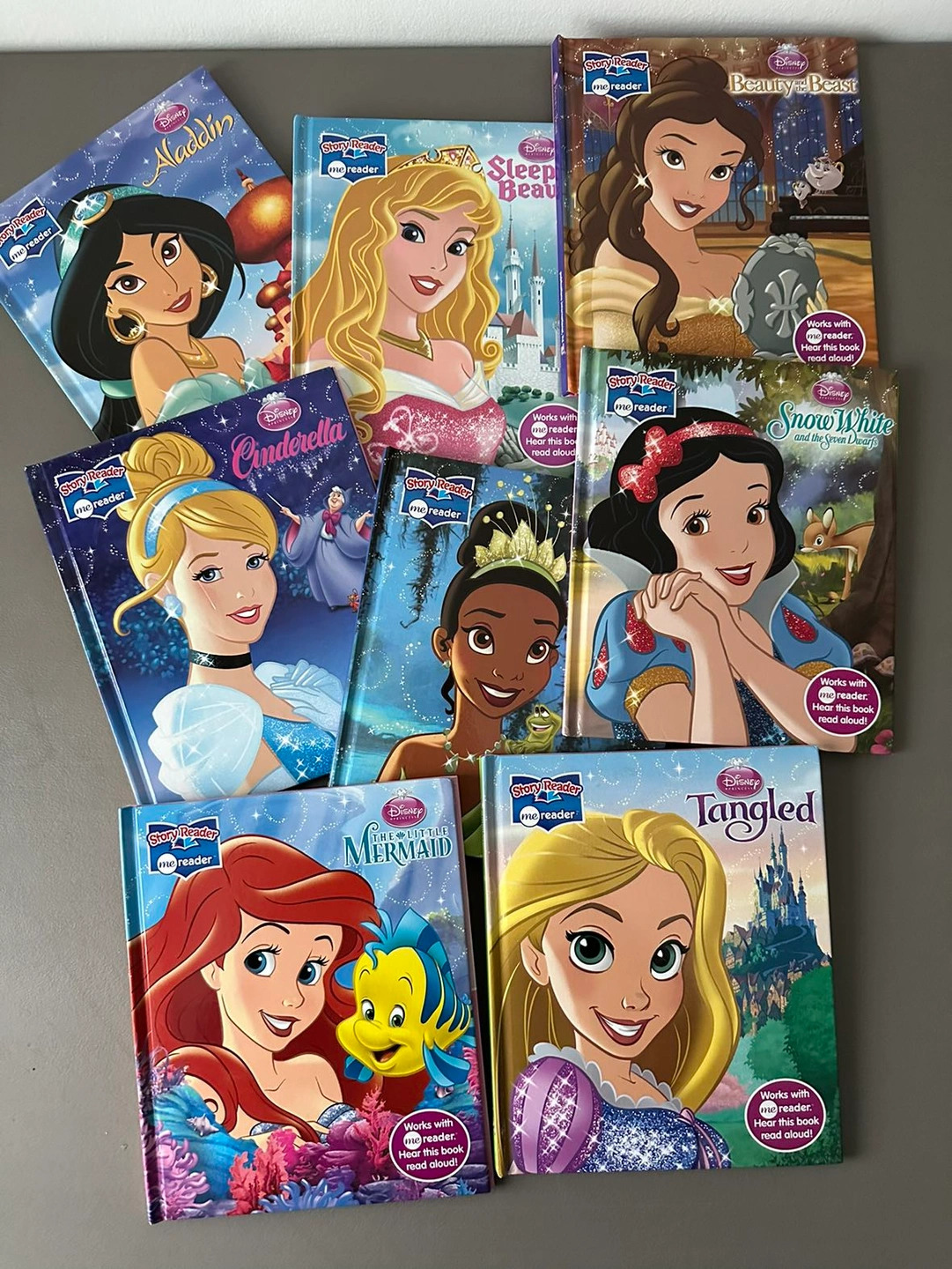 Disney Princess collection books featuring Jasmine, Sleeping Beauty, Belle, Ariel, Cinderella, Tiana, Snow White and Rupunzel.