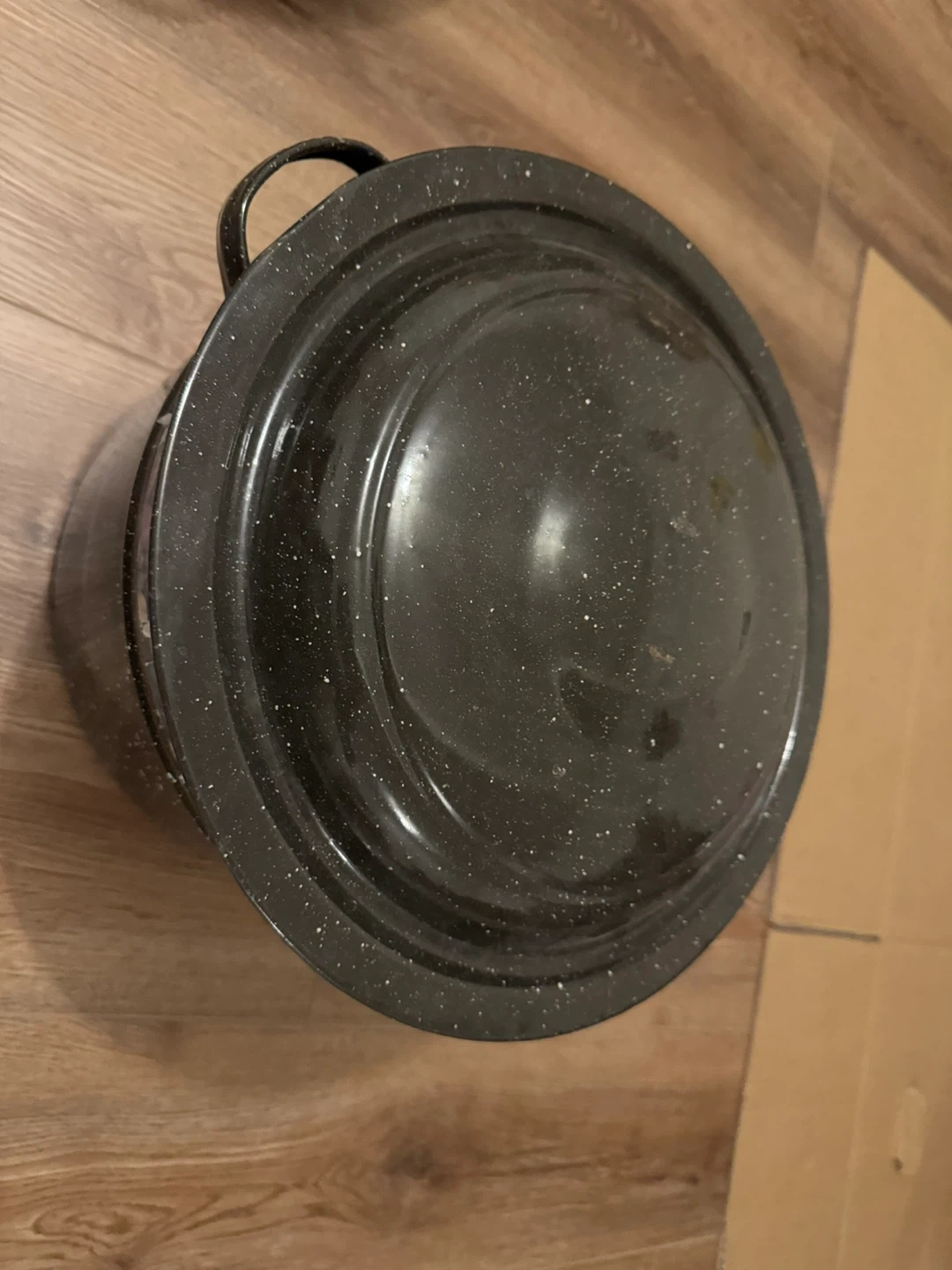 This large black speckled granite ware pot is perfect for canning. It comes with a rack inside for jars. It's a great size for preserving your harvest! Located in Penticton