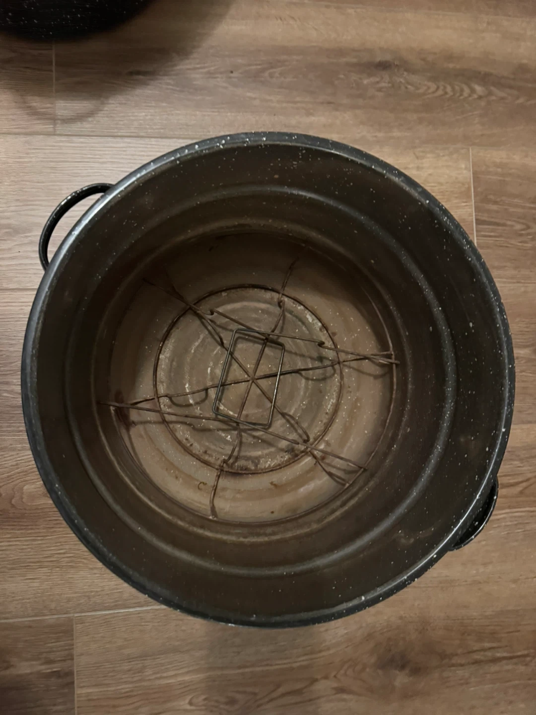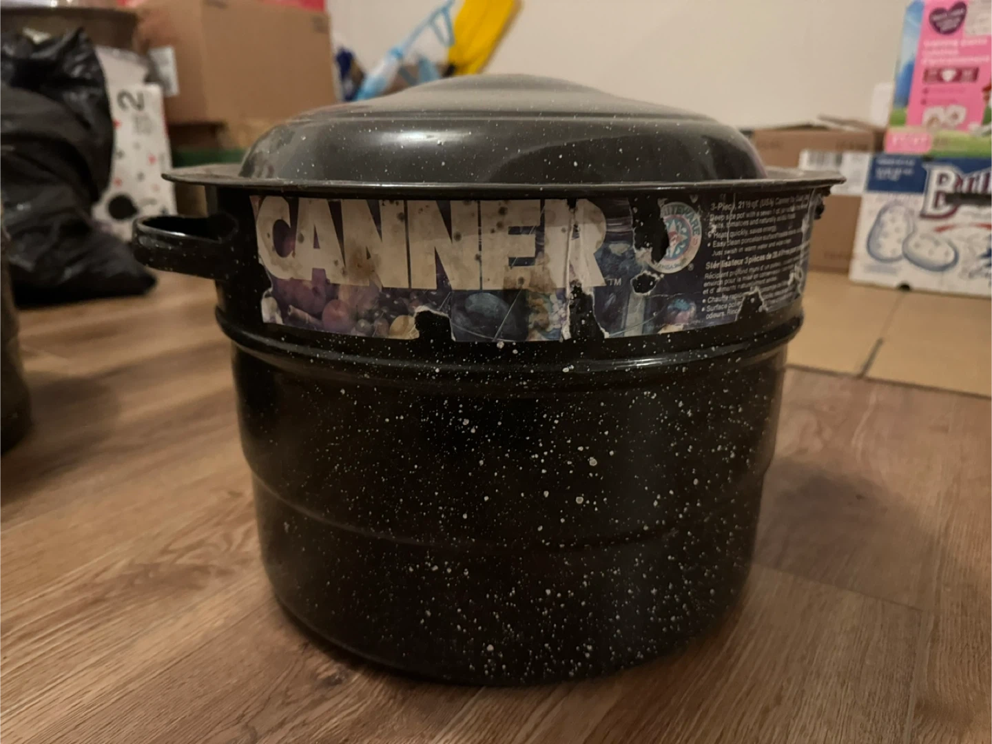 This large black speckled granite ware pot is perfect for canning. It comes with a rack inside for jars. It's a great size for preserving your harvest! Located in Penticton