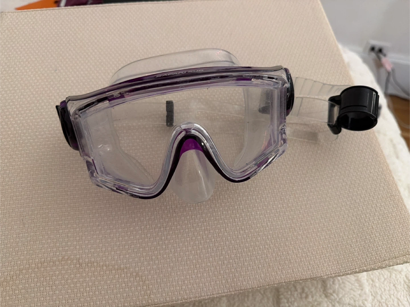 For Child: This is a Safari Sub snorkel mask with purple accents. It's made of durable plastic and silicone for a comfortable fit. Includes the snorkel tube.