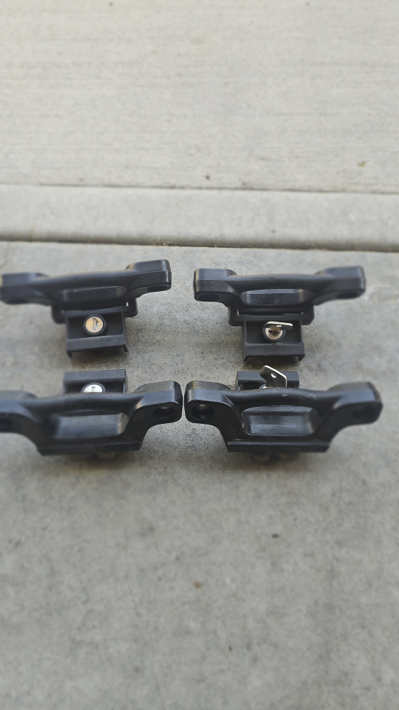 Selling a set of four black truck bed tie-down anchors. They look like they're in decent shape and ready to be used to secure your cargo. Perfect for anyone needing extra anchor points in their truck bed!