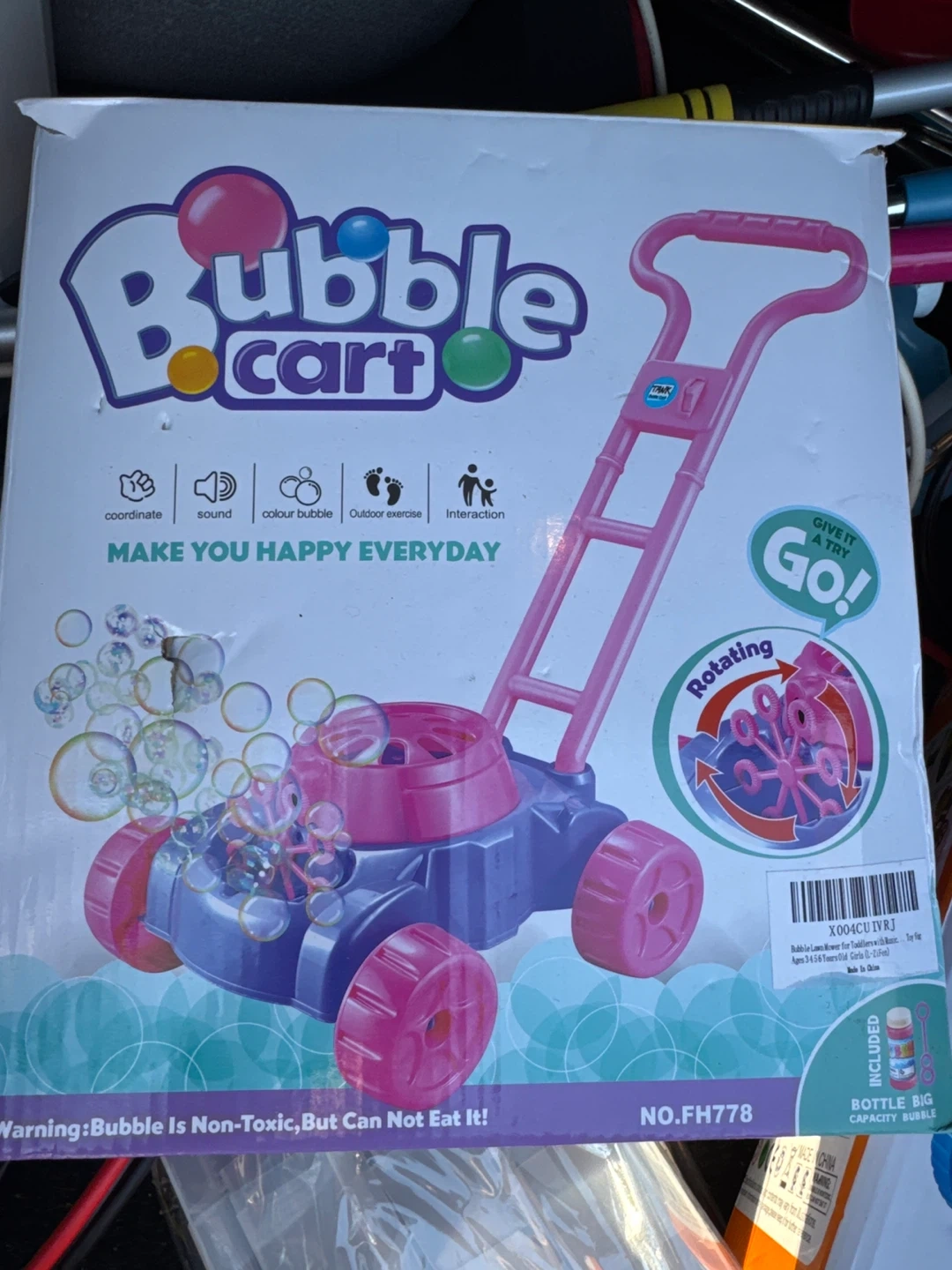 Get your little one outside with this fun bubble lawn mower toy! It's a great way to encourage outdoor exercise and interaction. The box says it's suitable for ages 3 and up. It's designed to coordinate, make sound, and be colourful, promising to make you happy every day! 20 dollars each