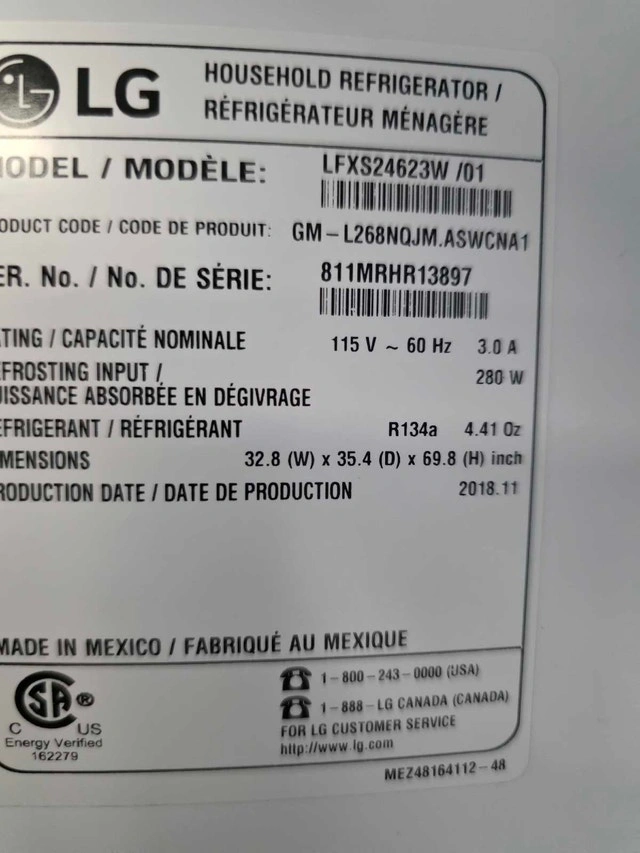LG French Door Refrigerator – $575 CAD. 3-MONTH WARRANTY included. Professional installation available. Old appliance disposal available. FRIDGE – LG LFXS24623W • 24.2 cu. ft. total capacity • Color: White | 33" wide • French door – bottom freezer • Thru-the-door ice & water dispenser • Slim SpacePlus® Ice System (frees up shelf space) • Smart Cooling® + Multi-Air Flow • Linear Compressor (10-year warranty) • 4 SpillProtector™ tempered glass shelves • Glide N' Serve® full-width pantry drawer • 2 humidity-controlled crisper drawers • 8 fixed door bins (gallon-sized) • 2-tier freezer drawer organization • Fresh Air Filter • LED interior lighting • LoDecibel™ quiet operation • SmartDiagnosis™ • ENERGY STAR® Certified. Feel free to message if you have any questions!