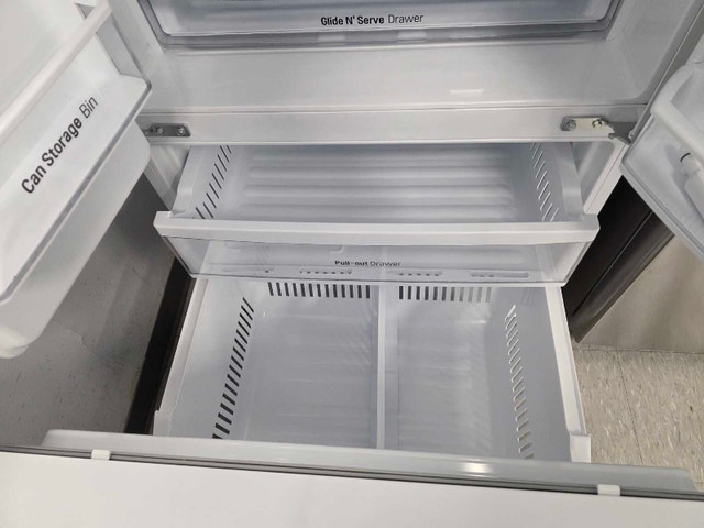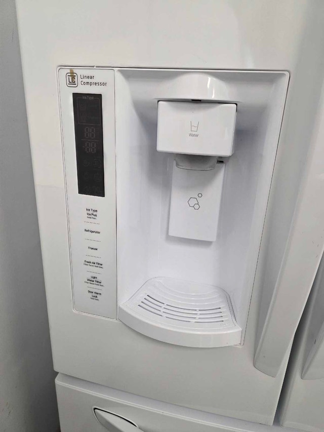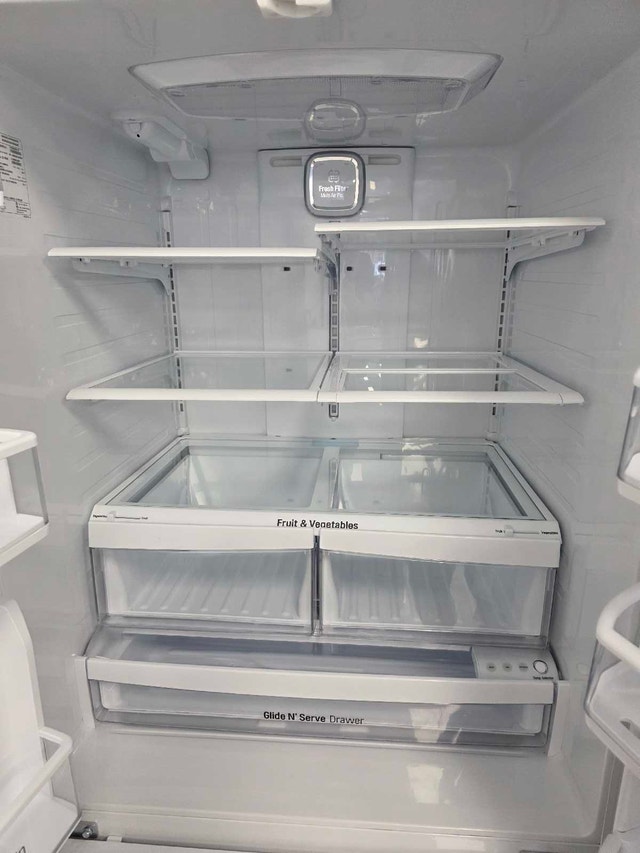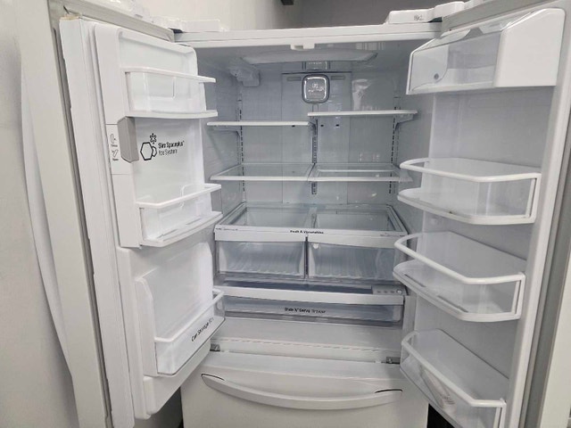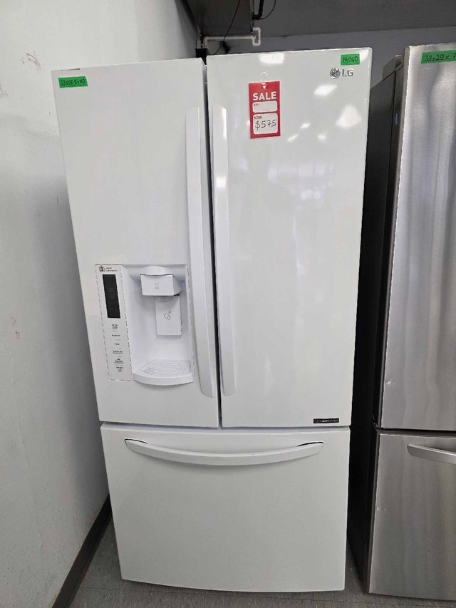 LG French Door Refrigerator – $575 CAD. 3-MONTH WARRANTY included. Professional installation available. Old appliance disposal available. FRIDGE – LG LFXS24623W • 24.2 cu. ft. total capacity • Color: White | 33" wide • French door – bottom freezer • Thru-the-door ice & water dispenser • Slim SpacePlus® Ice System (frees up shelf space) • Smart Cooling® + Multi-Air Flow • Linear Compressor (10-year warranty) • 4 SpillProtector™ tempered glass shelves • Glide N' Serve® full-width pantry drawer • 2 humidity-controlled crisper drawers • 8 fixed door bins (gallon-sized) • 2-tier freezer drawer organization • Fresh Air Filter • LED interior lighting • LoDecibel™ quiet operation • SmartDiagnosis™ • ENERGY STAR® Certified. Feel free to message if you have any questions!