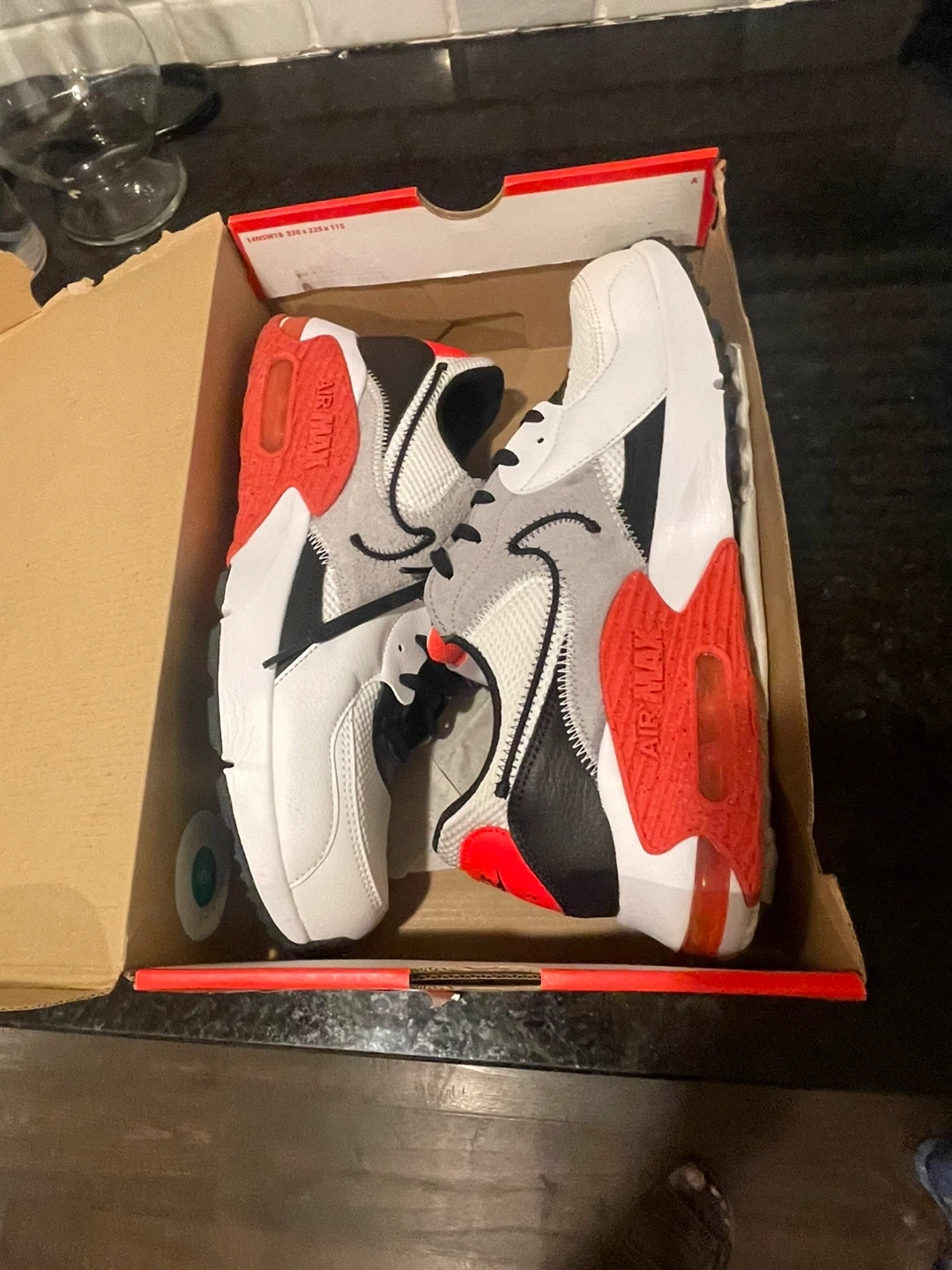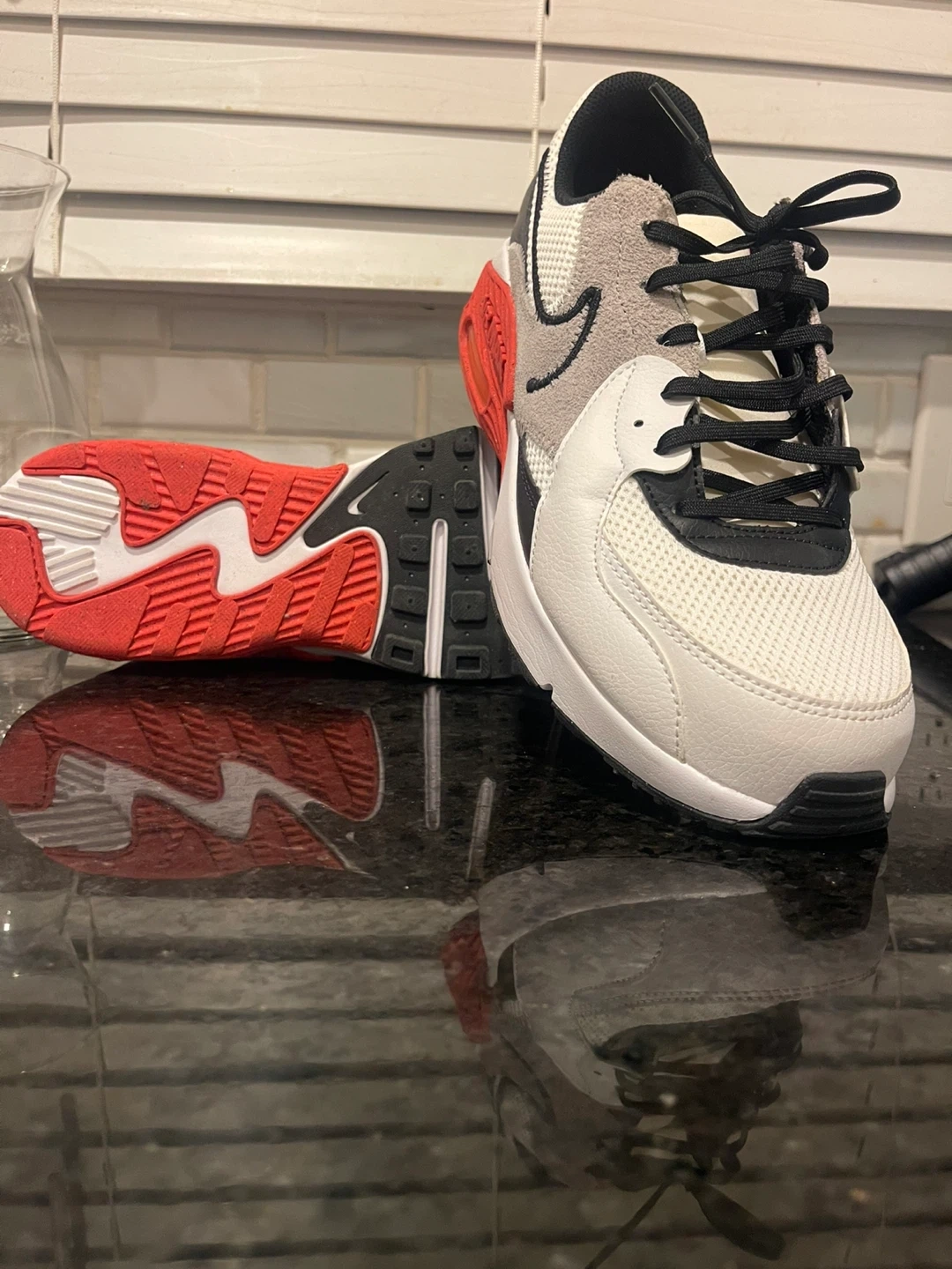 Selling a pair of Nike Air Max 90s in a white, black, gray and red colorway. The shoes are in good condition and come with the original box. Great for casual wear or working out!