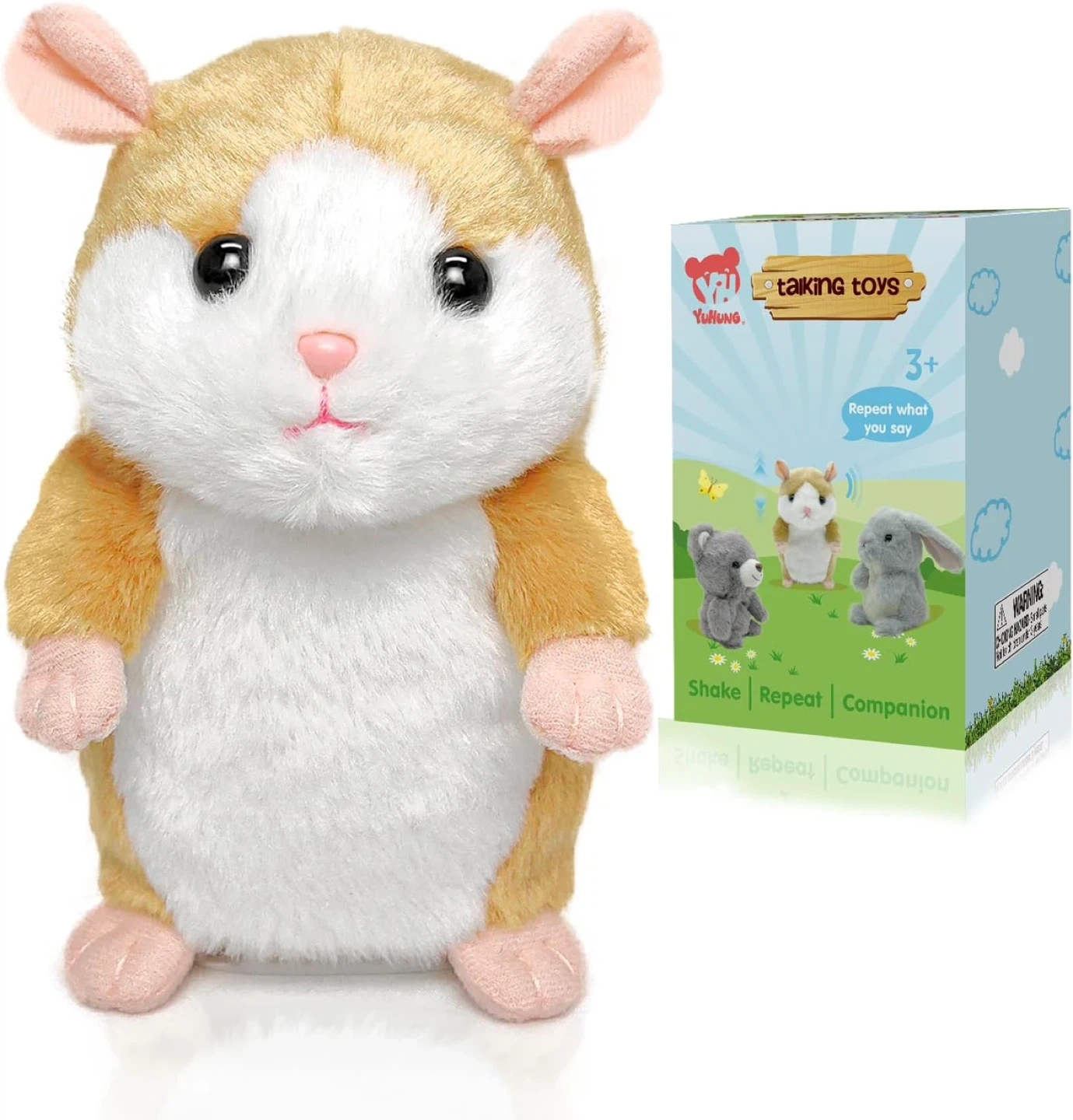 This cute talking hamster repeats anything you say in a funny voice! Just turn it on and talk to it. It will happily mimic your voice and move its head up and down. It's a great gift for kids ages 3 and up for birthdays, Easter, or Christmas. You'll have a blast playing with this interactive stuffed animal. Dimensions are approximately 3.7" L x 3.5" W x 5.7" H. Requires 3xAAA batteries (not included). We recommend removing the batteries if you plan to store it for a long time. Made by YH YUHUNG.