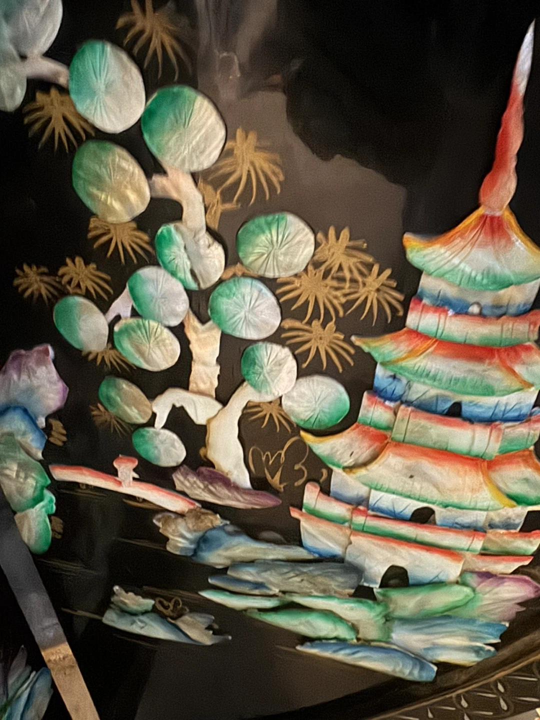 Selling a beautiful vintage Asian-style folding screen room divider! It features intricate mother-of-pearl inlays depicting landscapes and pagodas on a black lacquered background. This unique piece would add a touch of elegance to any room. It's in good condition with some minor wear consistent with its age