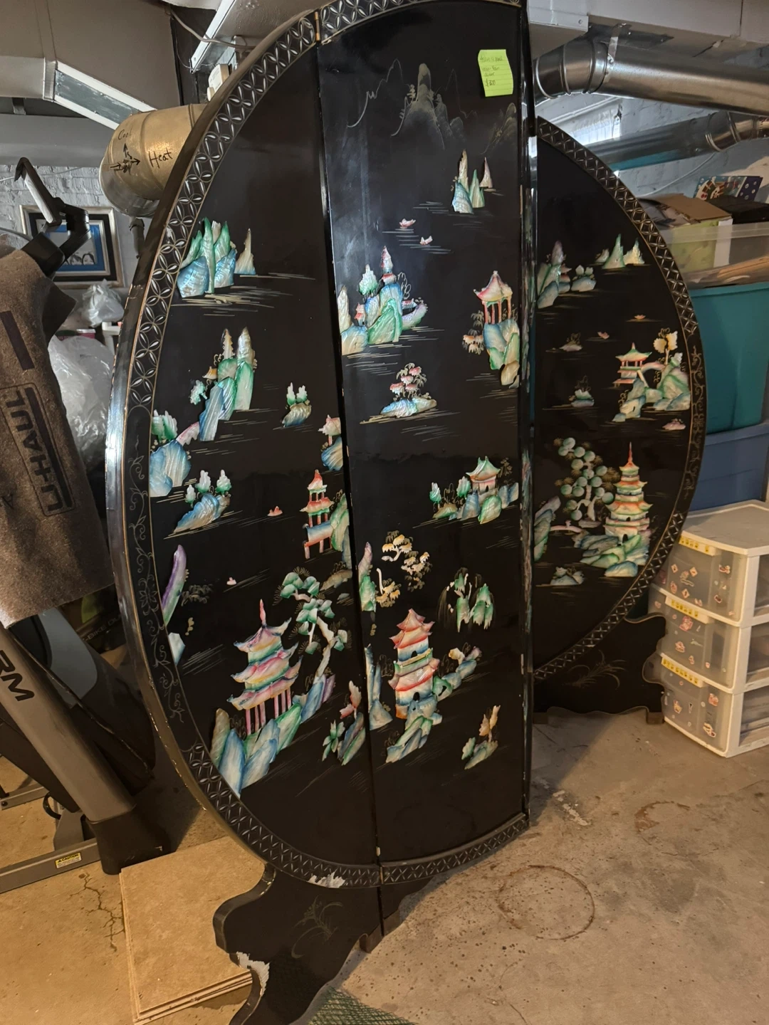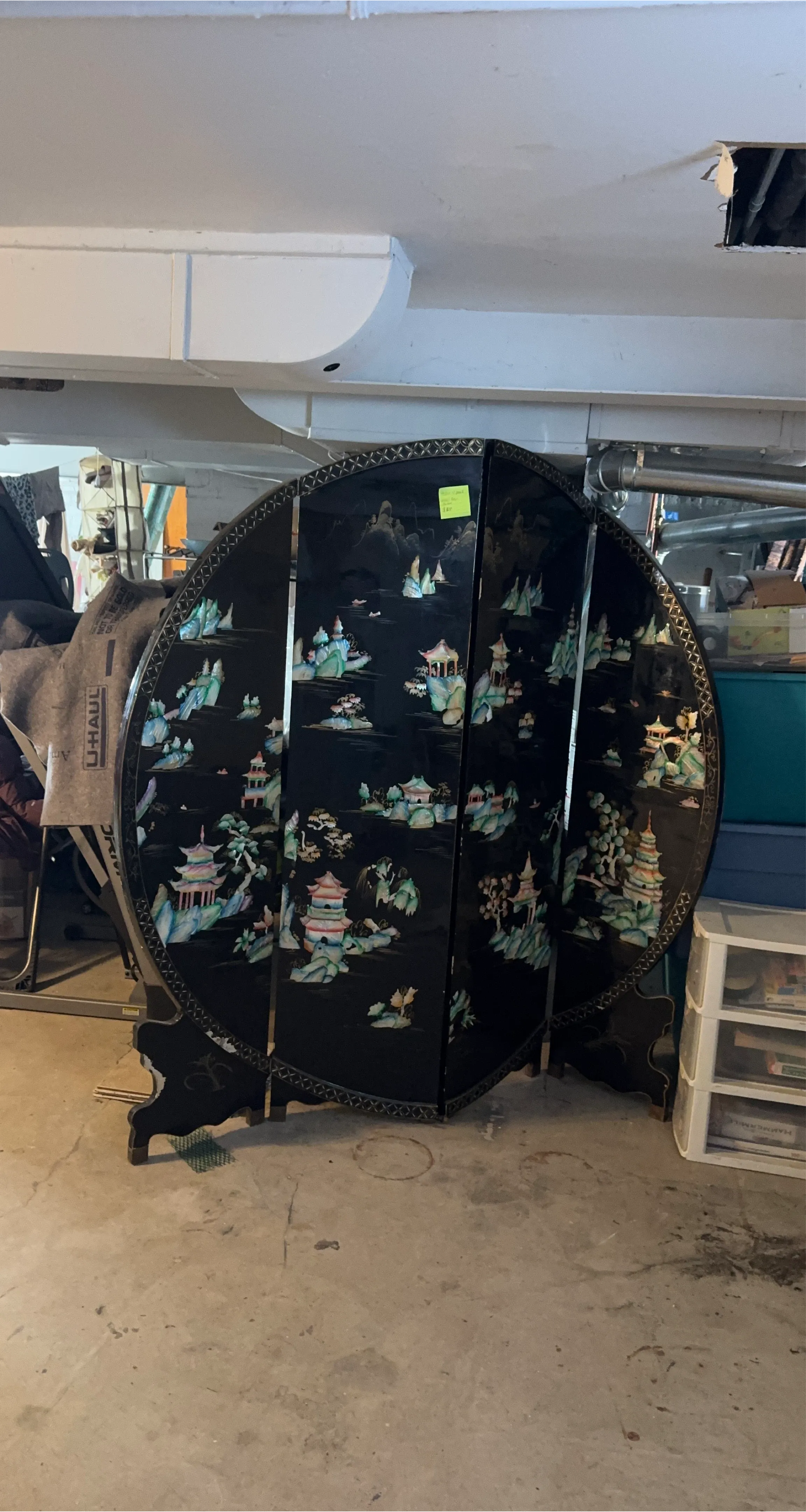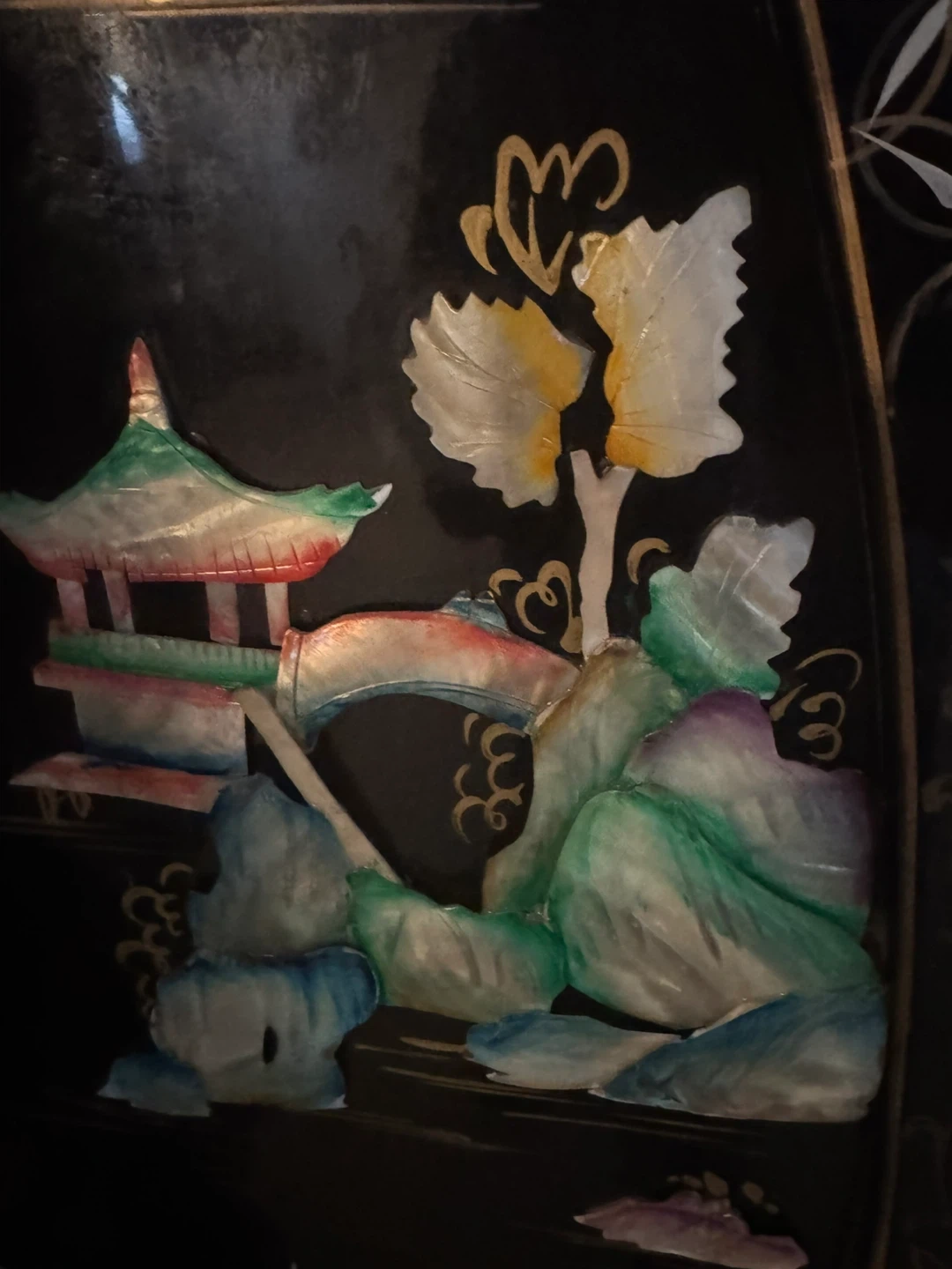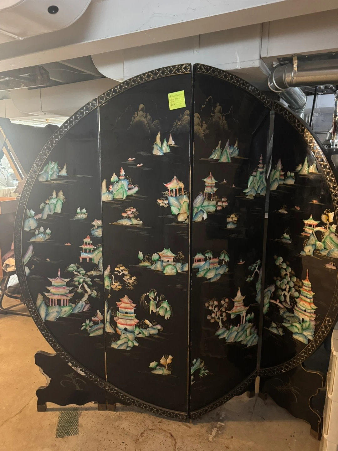 Selling a beautiful vintage Asian-style folding screen room divider! It features intricate mother-of-pearl inlays depicting landscapes and pagodas on a black lacquered background. This unique piece would add a touch of elegance to any room. It's in good condition with some minor wear consistent with its age