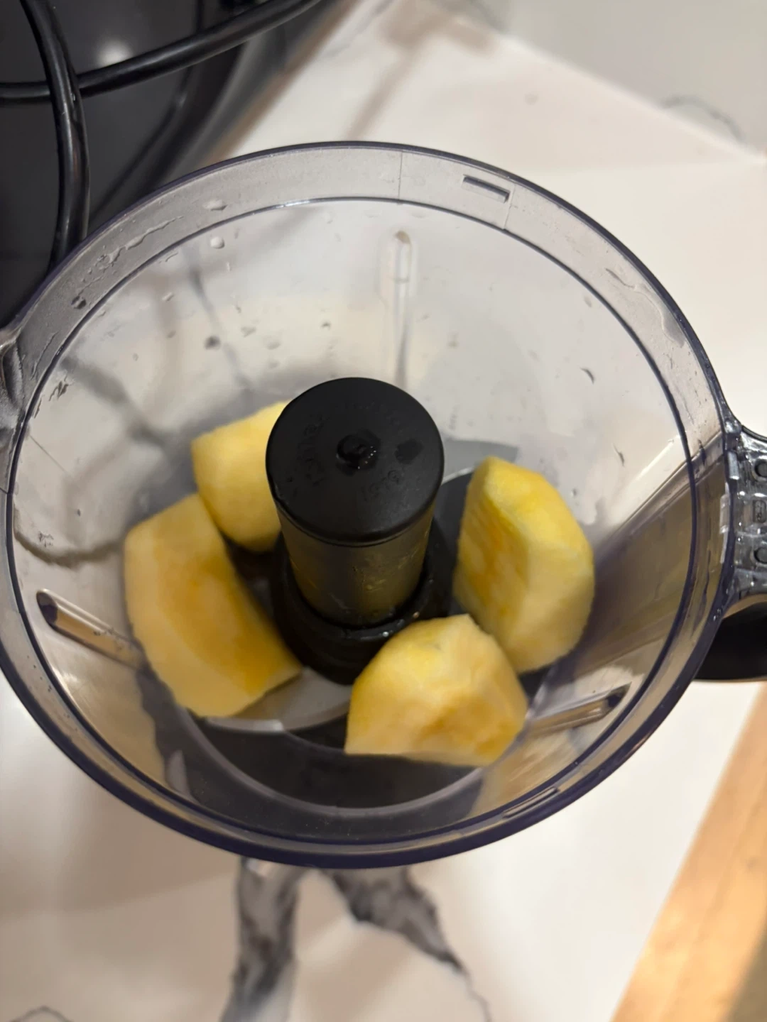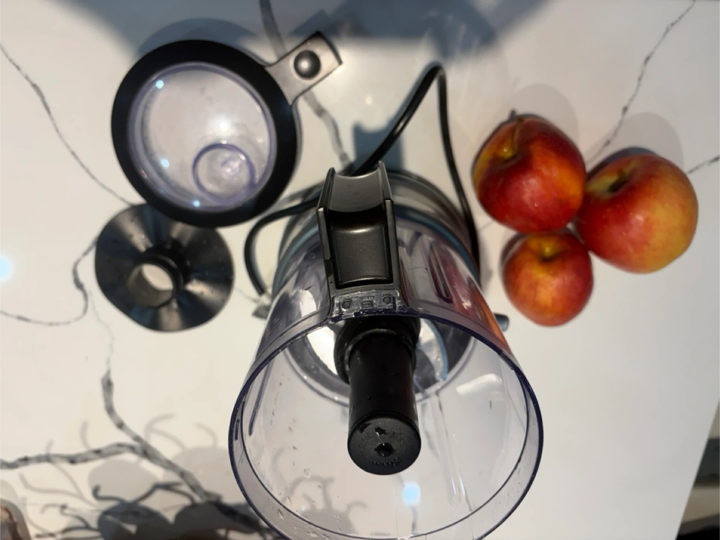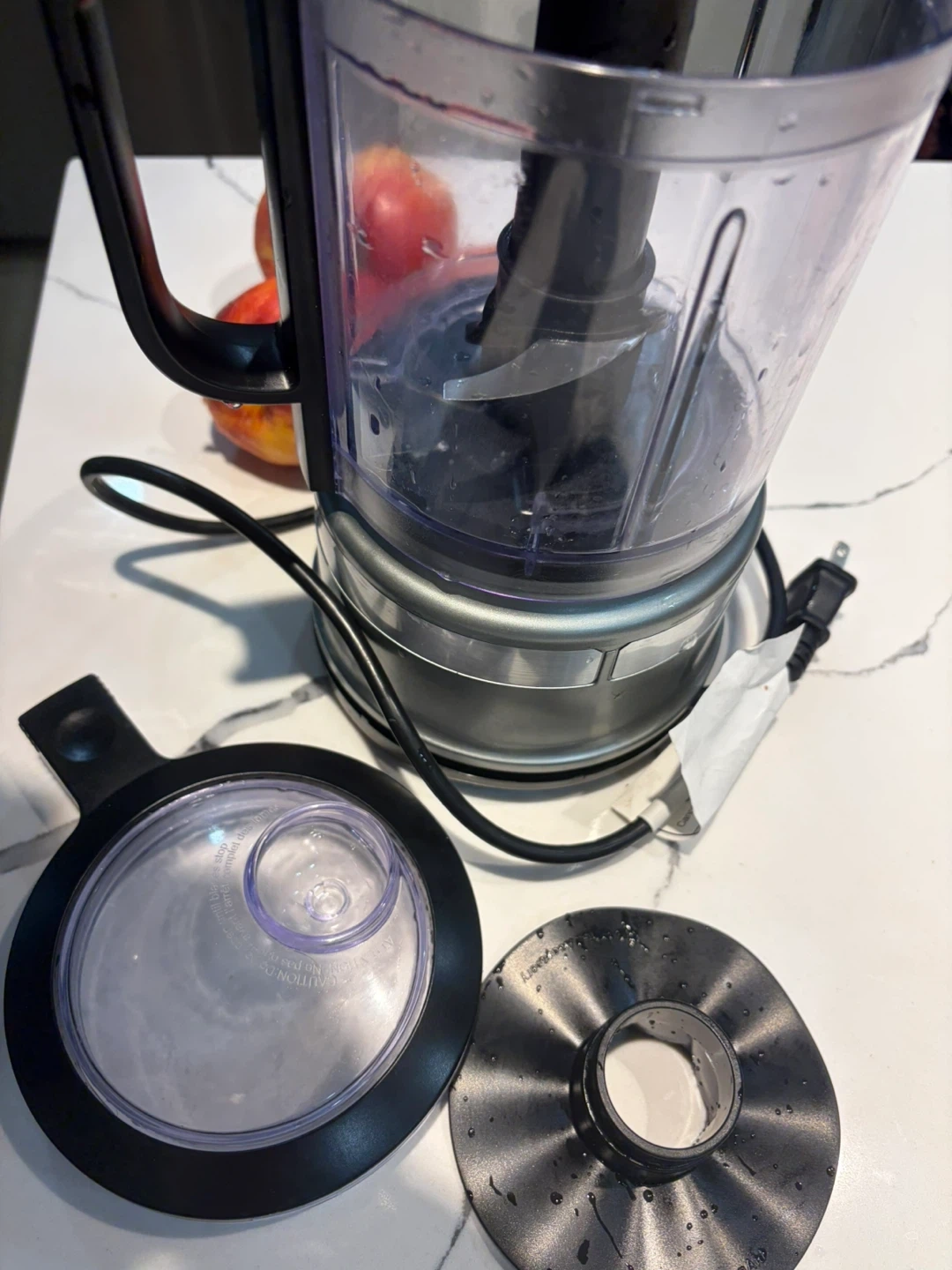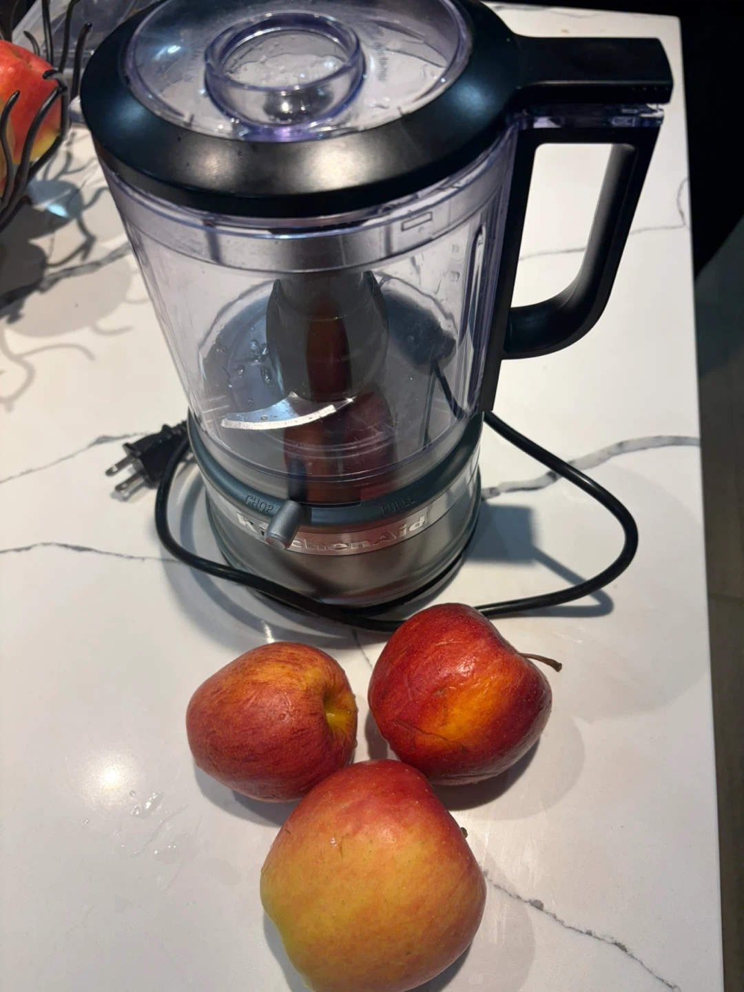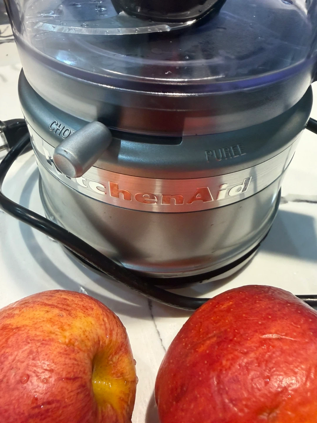 This is a KitchenAid food processor. It has a clear bowl and comes with a blade assembly and lid. It's perfect for chopping vegetables or pureeing ingredients quickly.