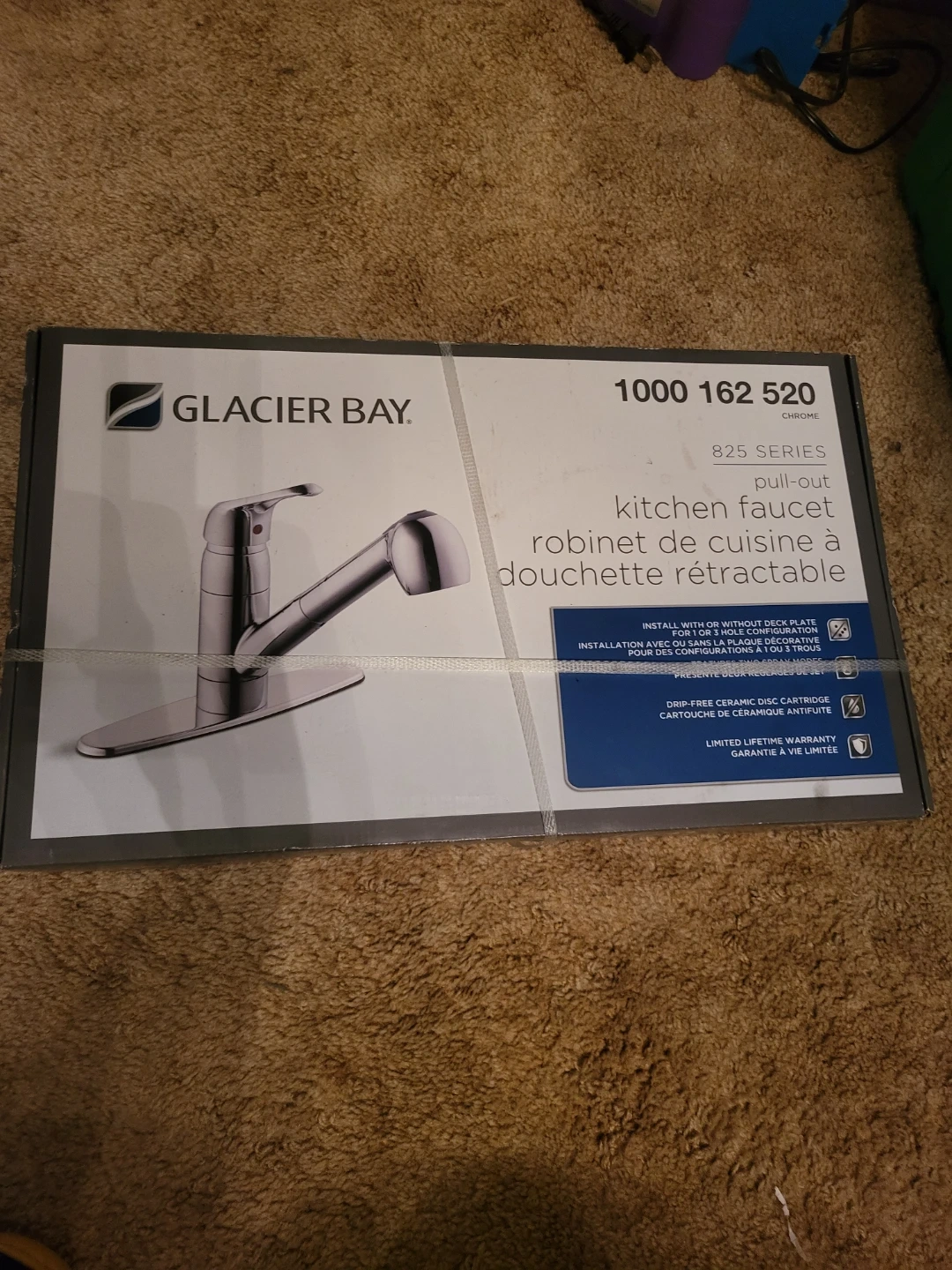 Glacier Bay 825 Series pull-out kitchen faucet in chrome. It's a new-in-box item with a drip-free ceramic disc cartridge. This faucet is designed for 1 or 3 hole configurations.