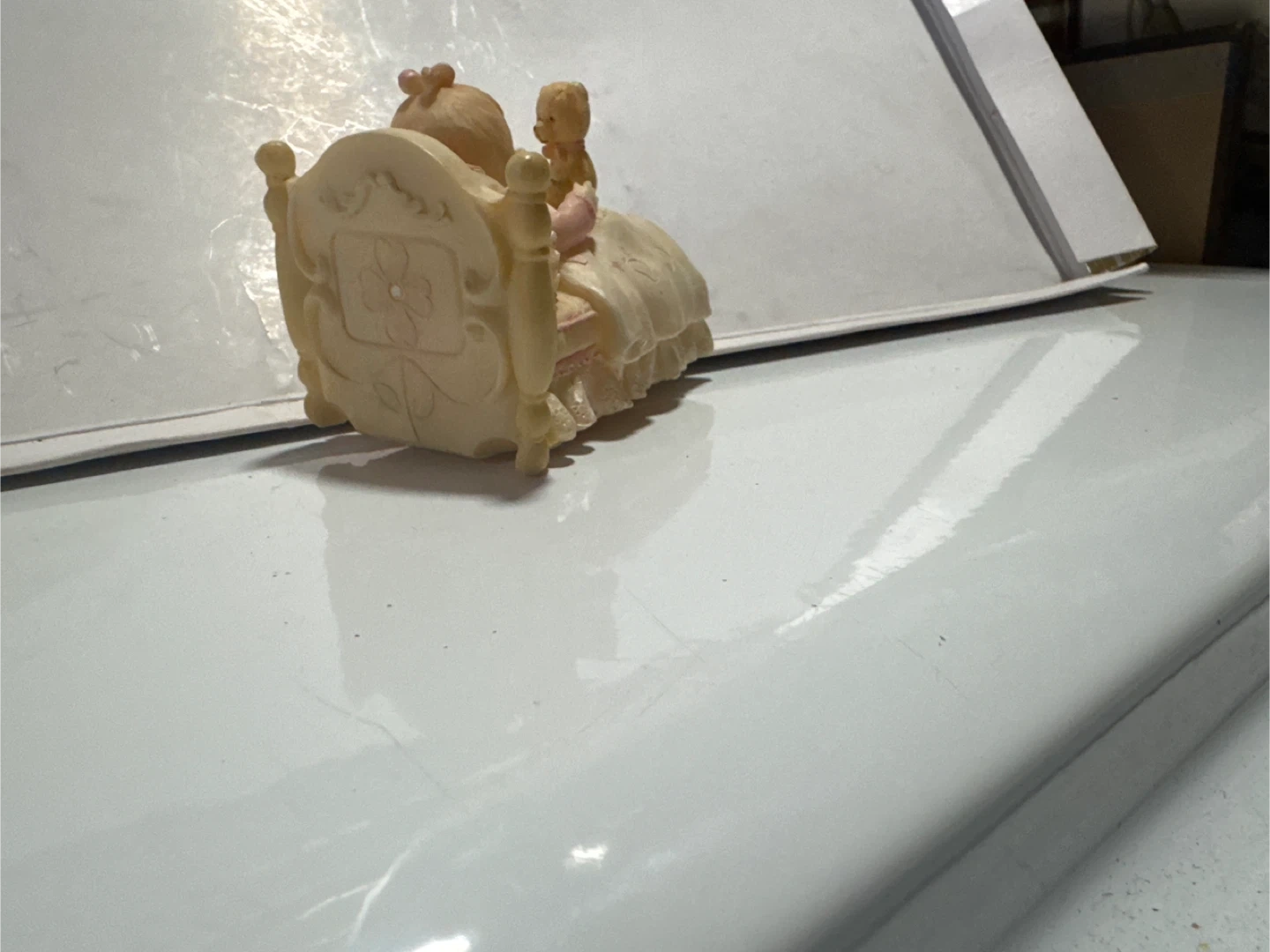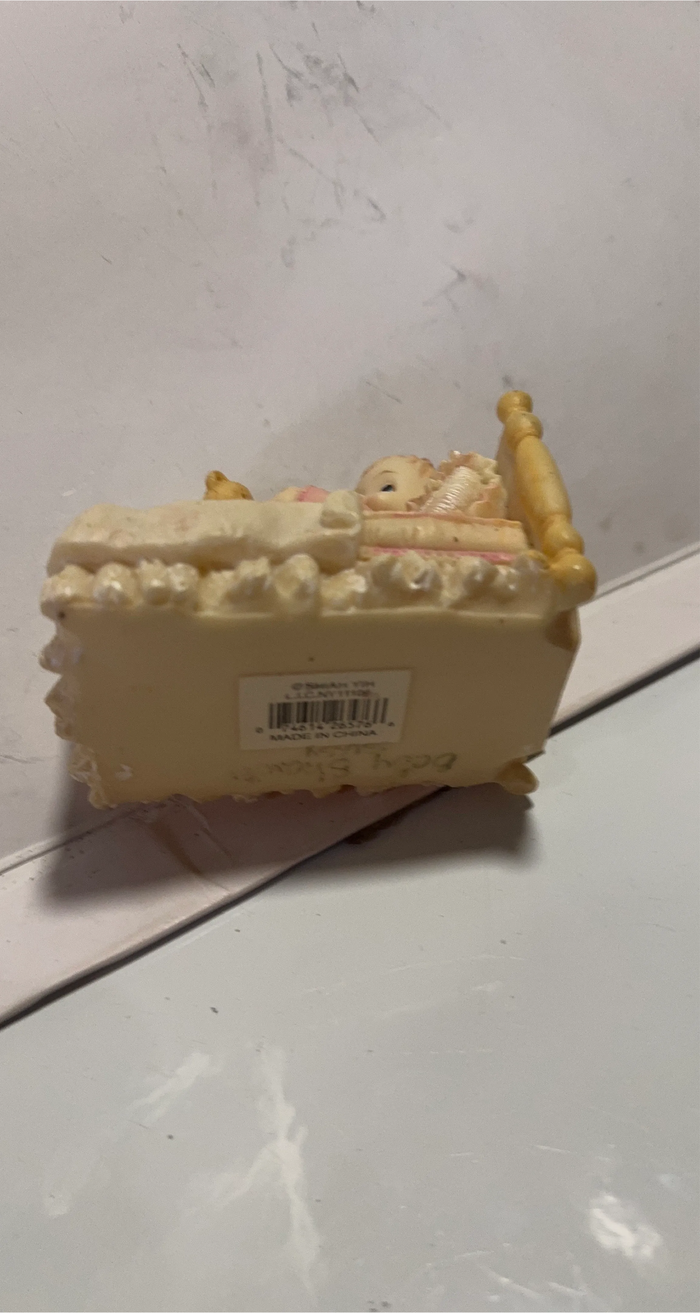 This is a Precious Moments figurine ( not sure if it’s label correctly) of a baby doll sleeping in a bed with a teddy bear. It's a cute addition to any collection or nursery decor