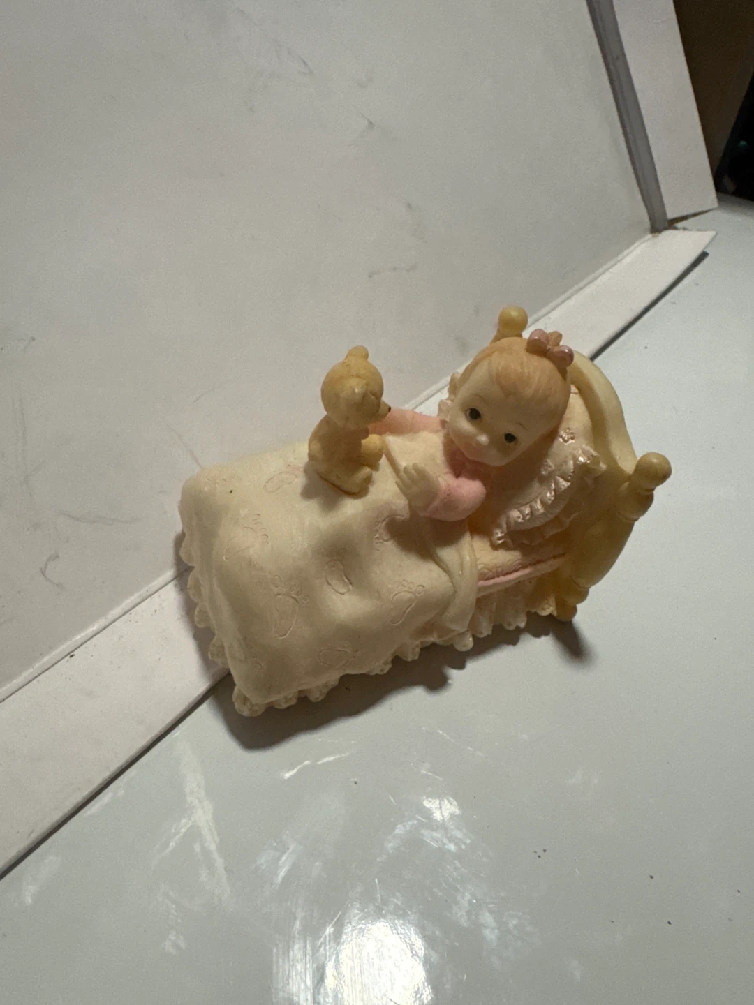 This is a Precious Moments figurine ( not sure if it’s label correctly) of a baby doll sleeping in a bed with a teddy bear. It's a cute addition to any collection or nursery decor