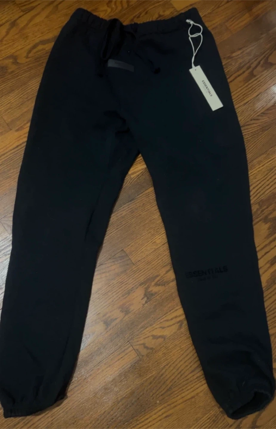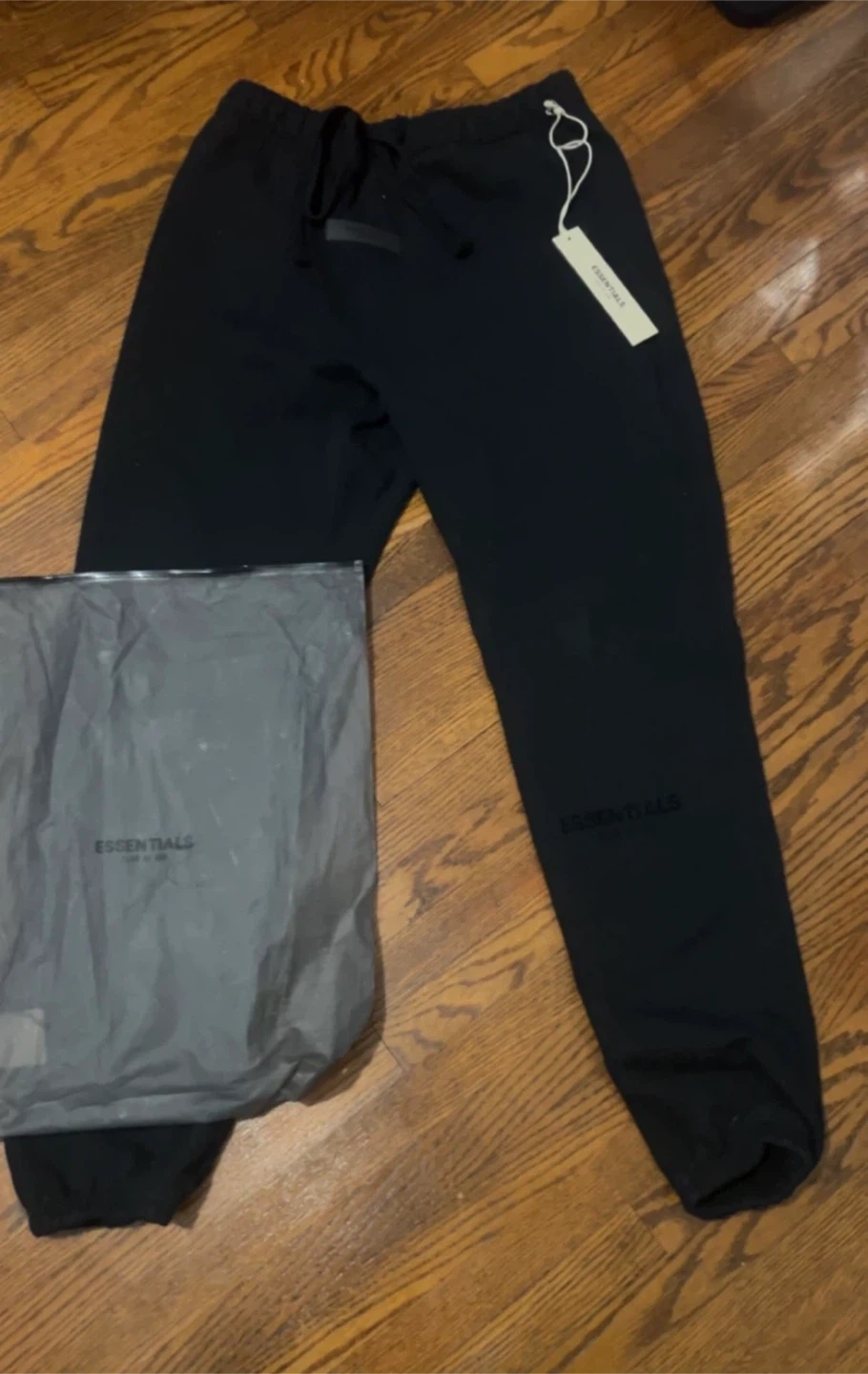 Black sweatpants from Essentials, part of Fear of God. Elastic waistband with drawstring closure. Includes original dust bag. Made for comfort. Men’s small