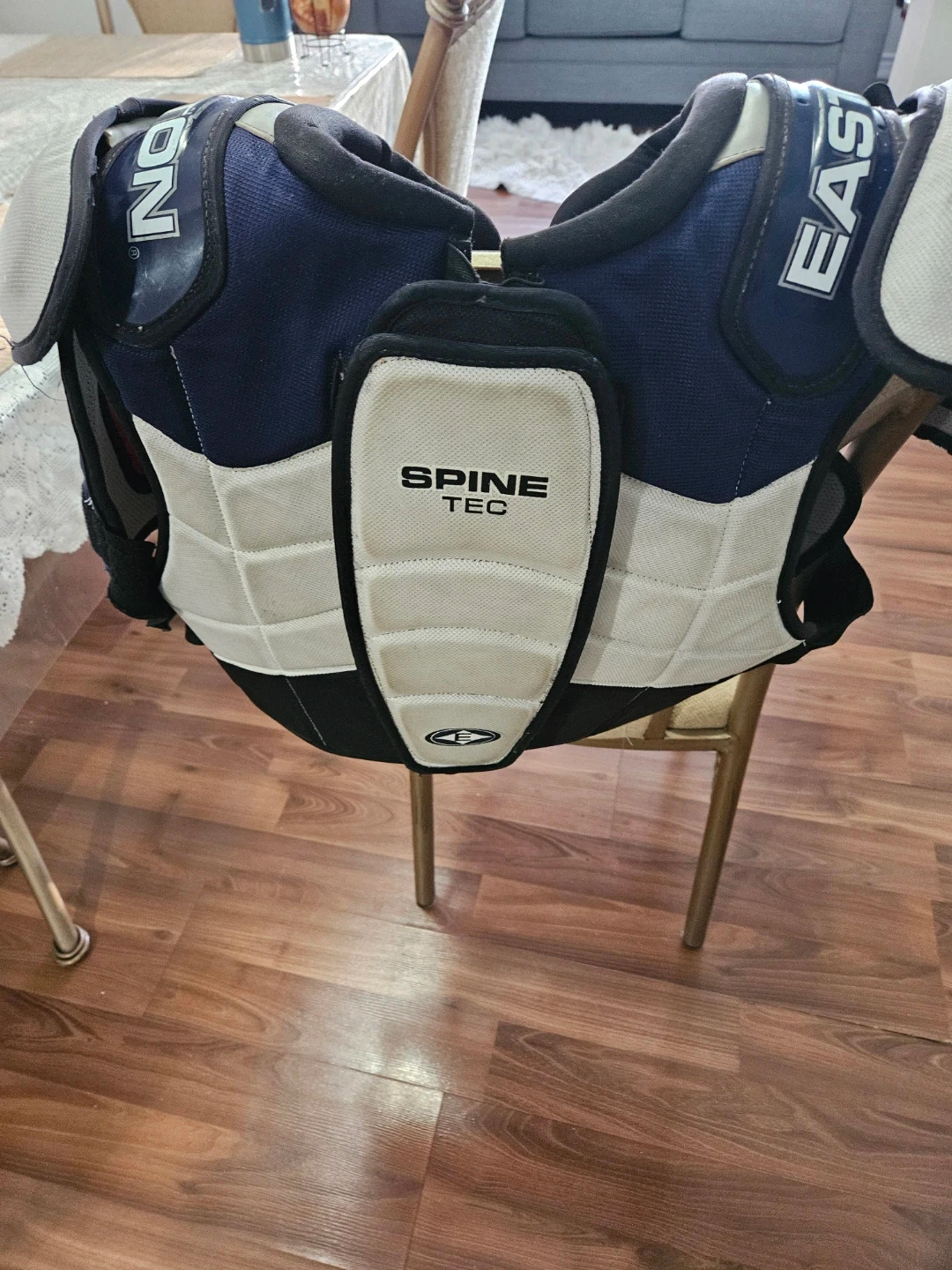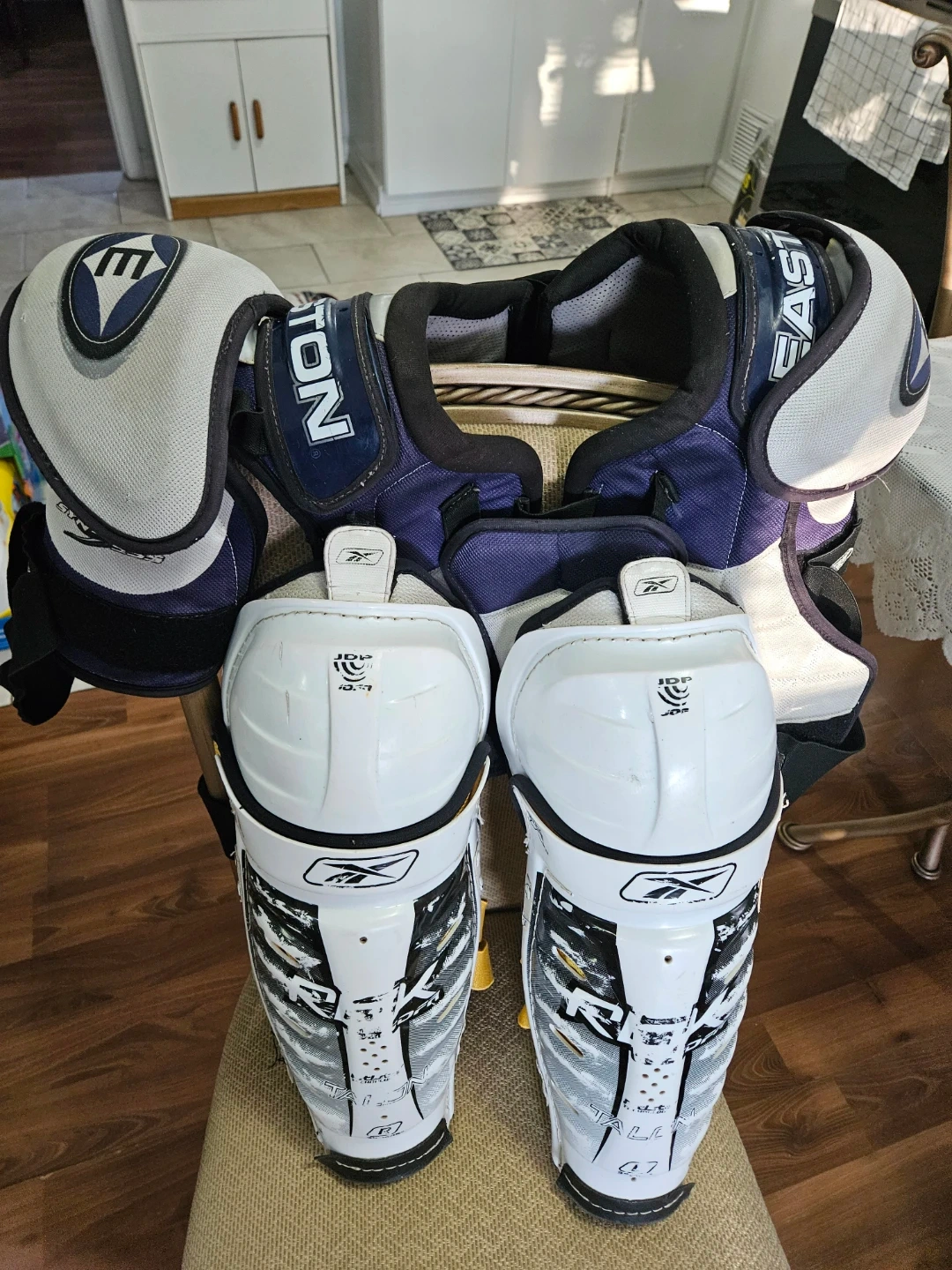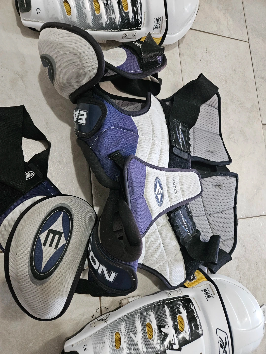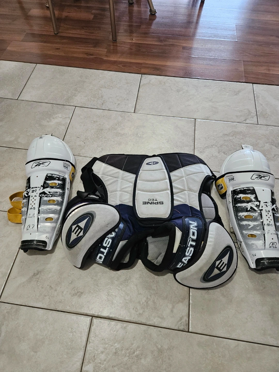 Selling a set of Easton Synergy shoulder pads and Reebok shin guards. The shoulder pads are size large and feature Spine Tec. The shin guards are white with black and grey accents.