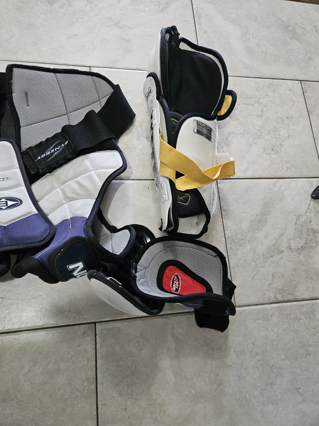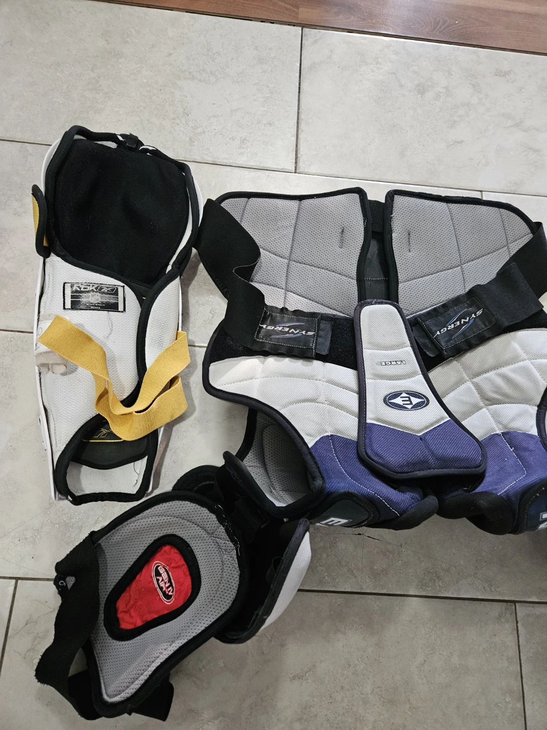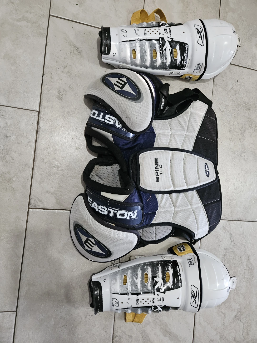 Selling a set of Easton Synergy shoulder pads and Reebok shin guards. The shoulder pads are size large and feature Spine Tec. The shin guards are white with black and grey accents.