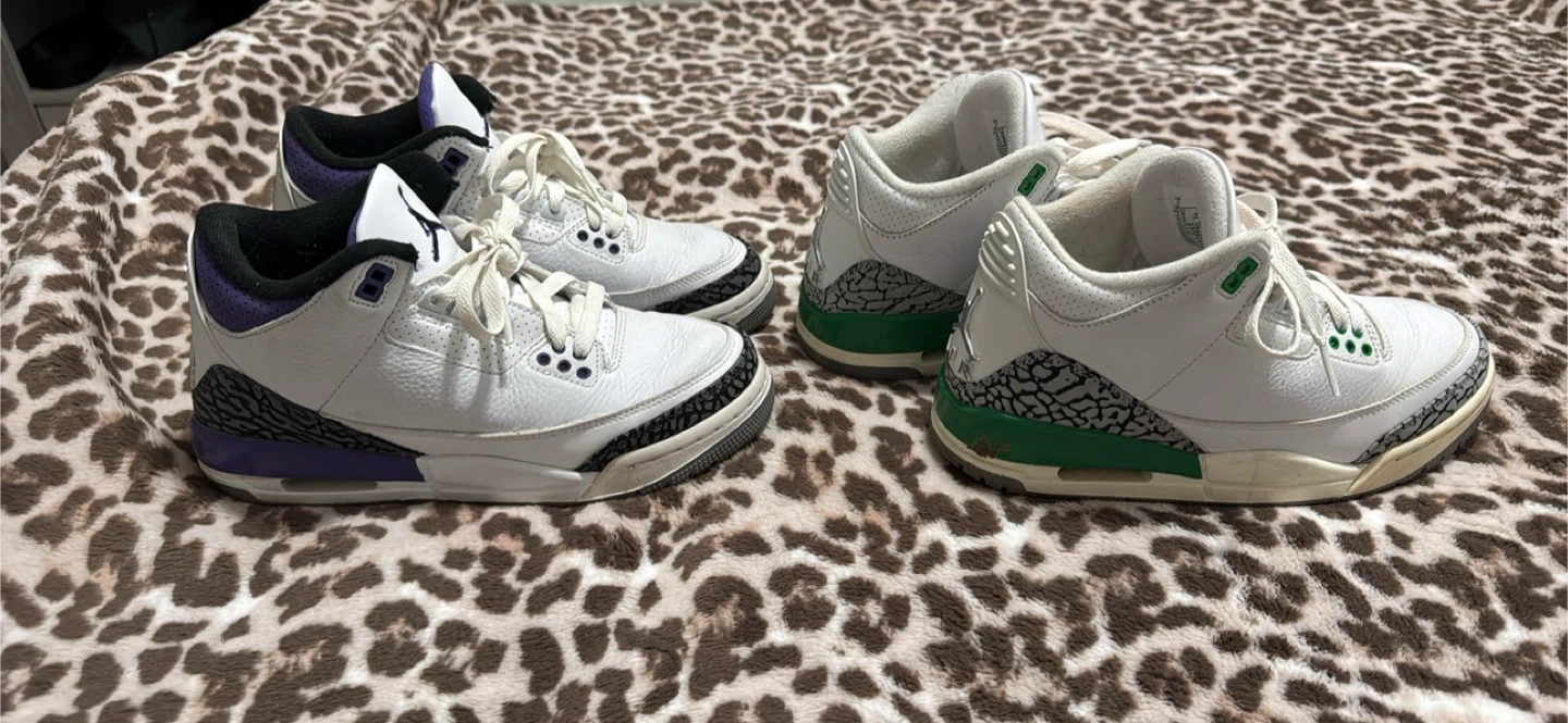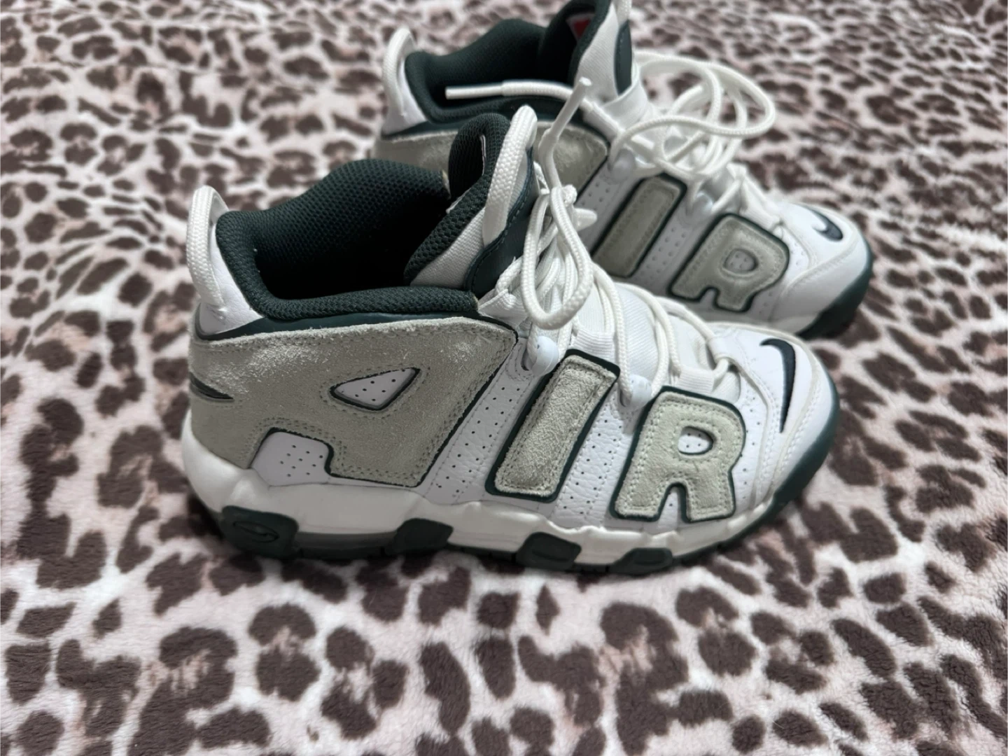 These are classic Nike Air More Uptempo sneakers in a white and green colourway. They're a cool retro basketball shoe. 150 per pair (they are collectors and come with boxes) Jordon black cats are 180.