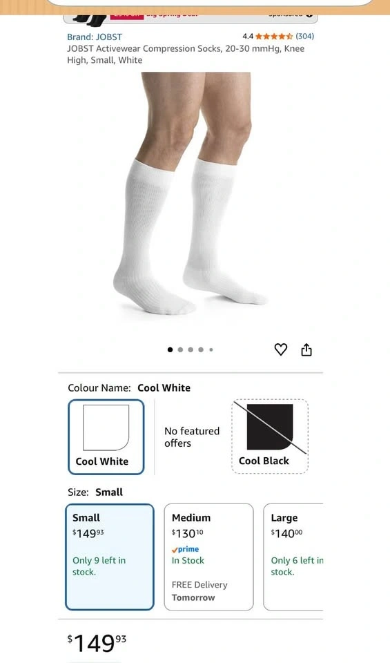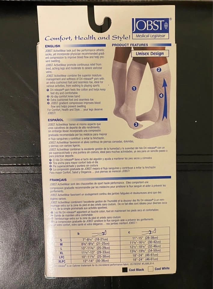 JOBST ActiveWear Firm compression knee high socks, 20-30mmhg. Size small. Available in Black or White. Pick up in Tottenham, New Tecumseth. $75.