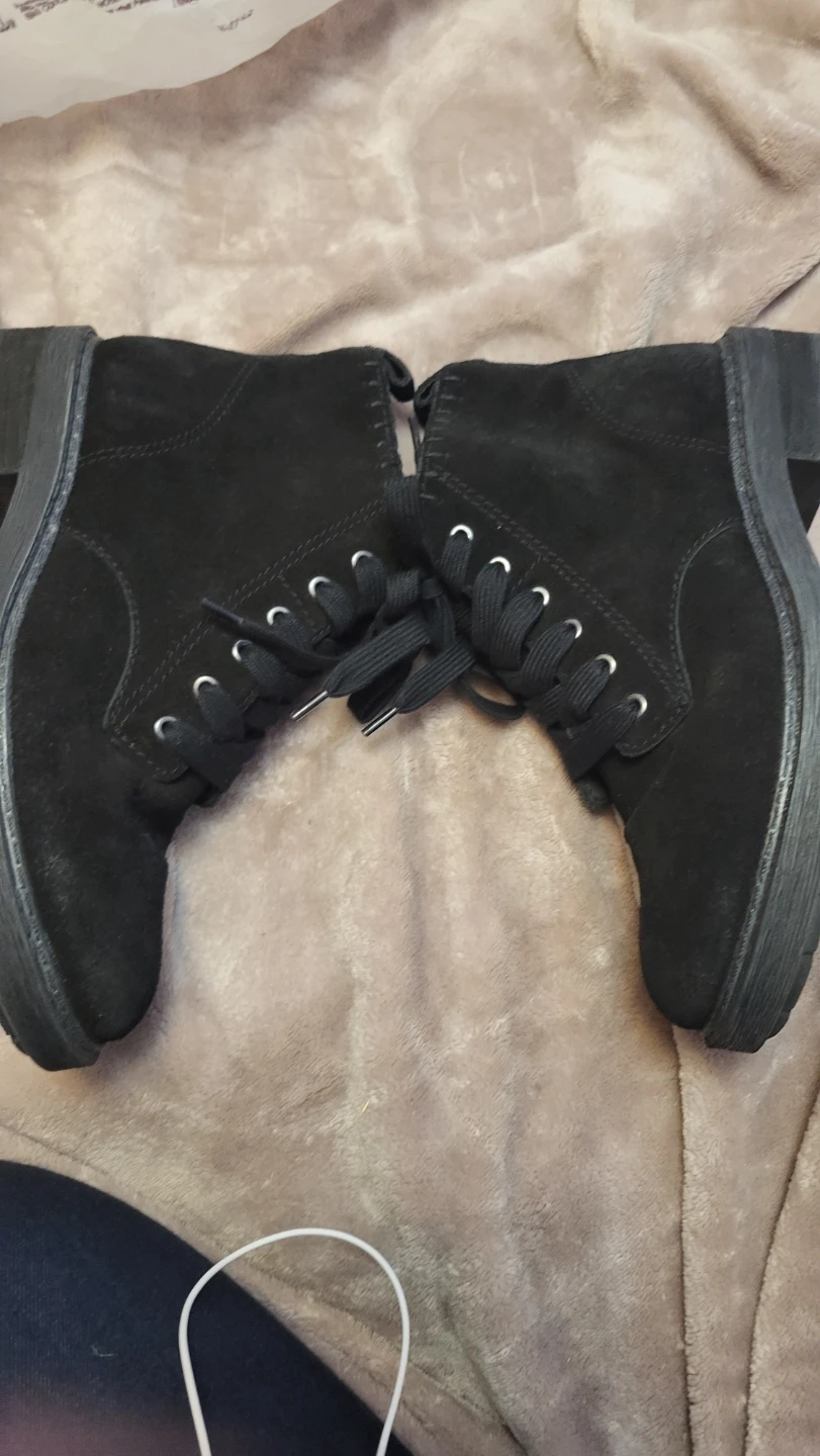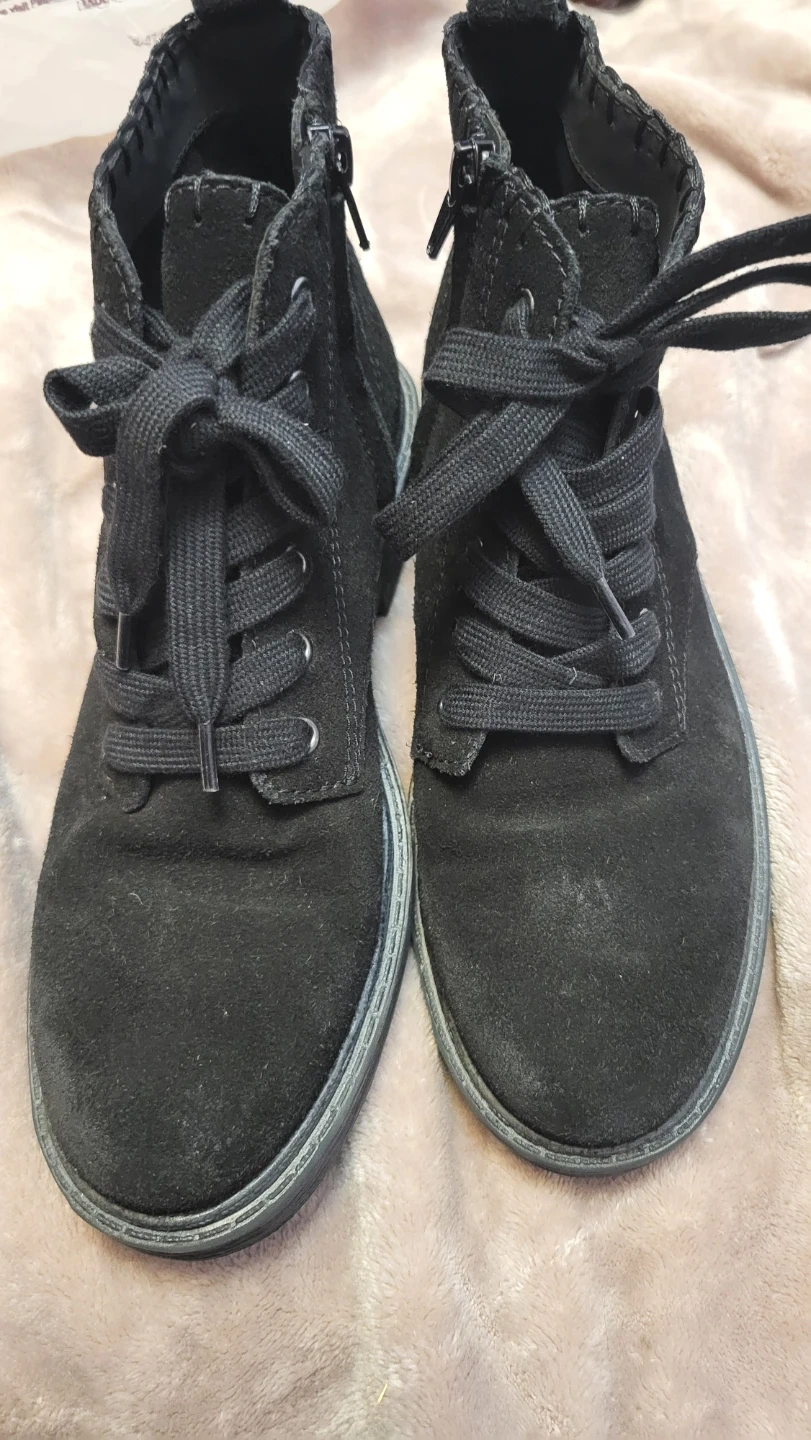Selling a pair of black suede ankle boots. They are a size 8 and have a lace-up front with a side zipper for easy on and off. The soles are in good condition, ready for a new home!