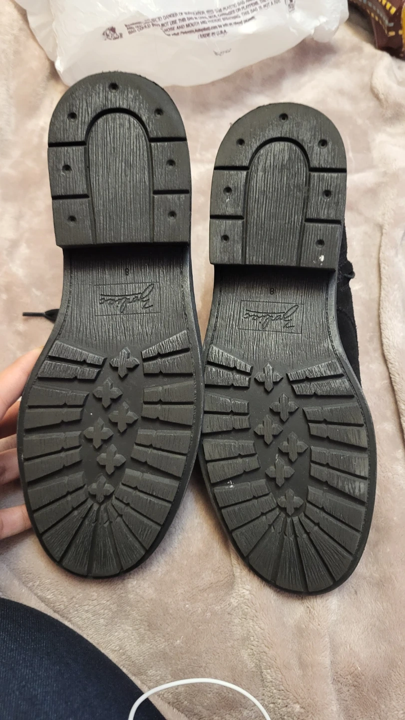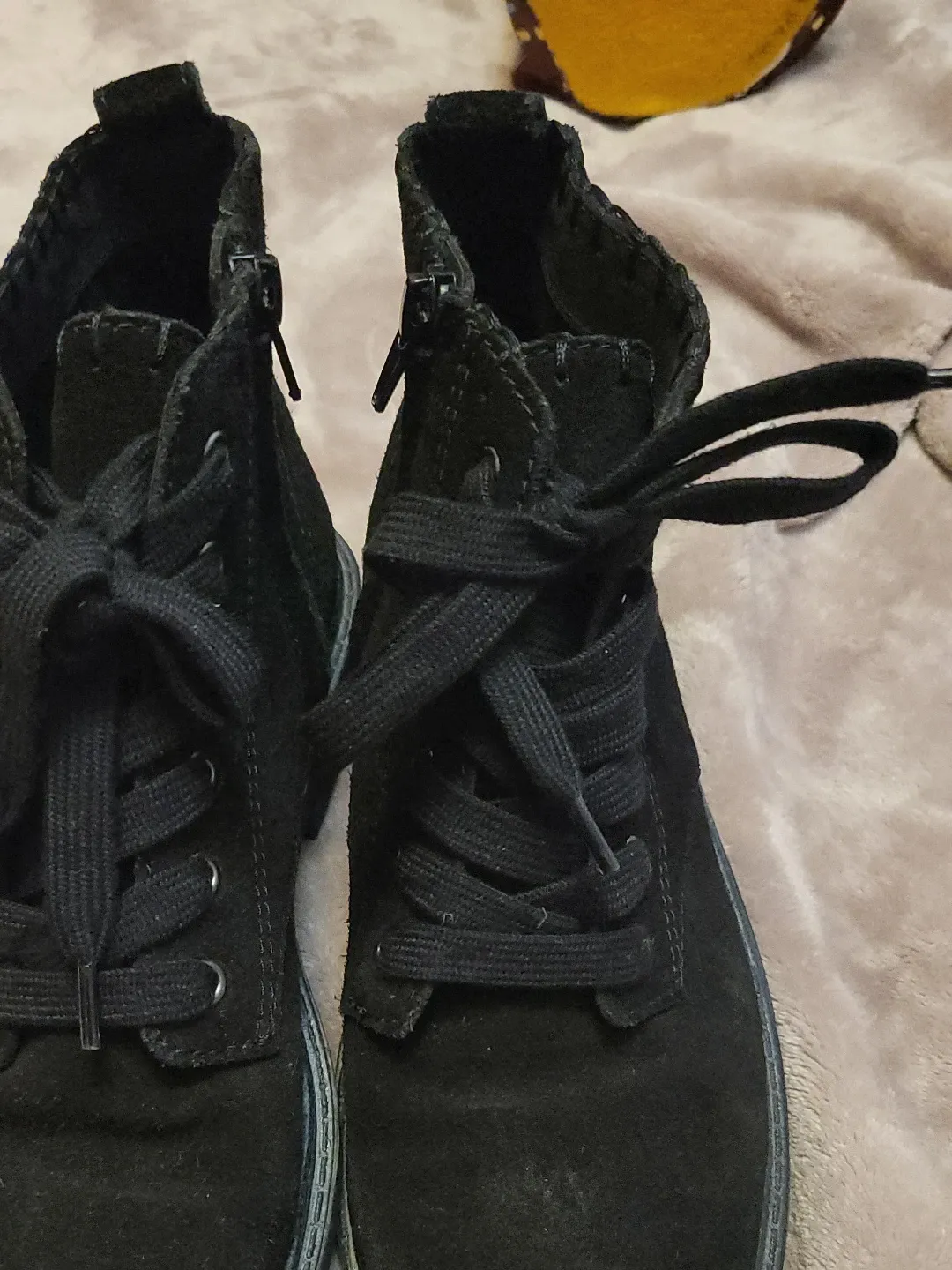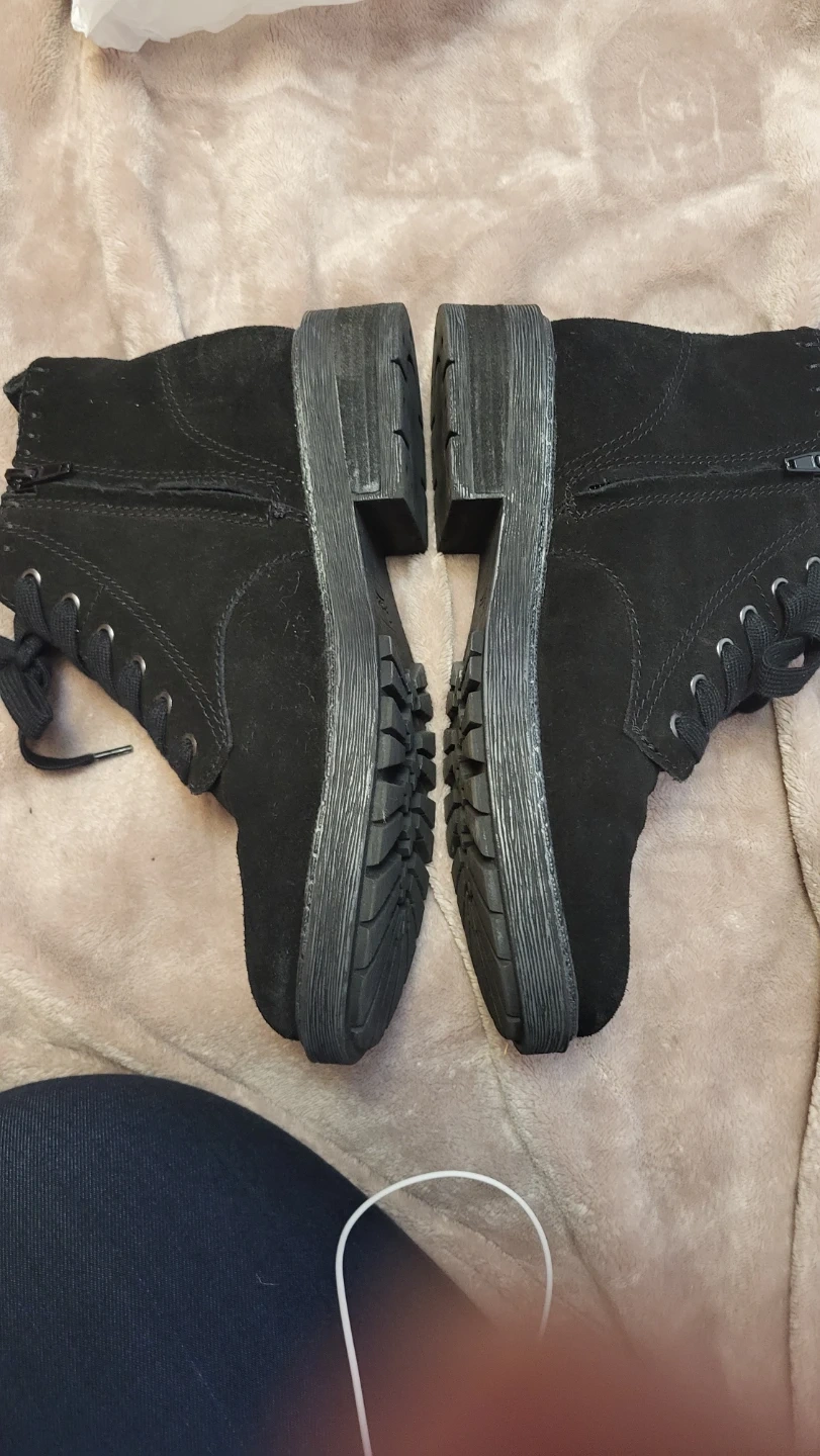 Selling a pair of black suede ankle boots. They are a size 8 and have a lace-up front with a side zipper for easy on and off. The soles are in good condition, ready for a new home!