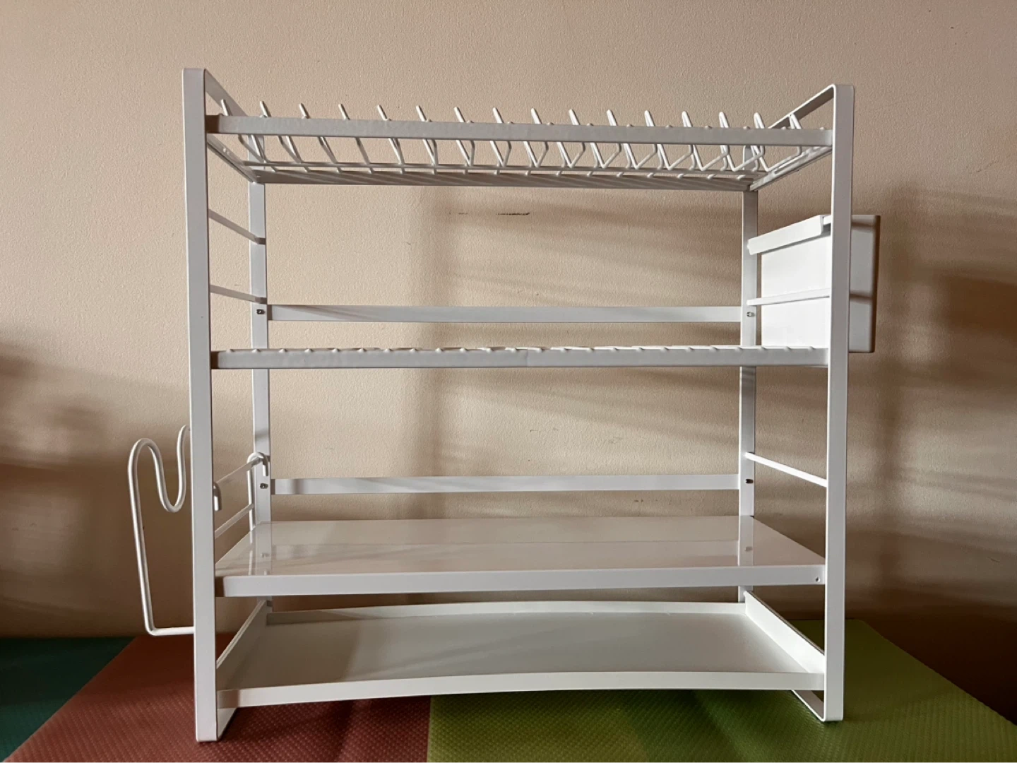 Can pack it back into the box shown in the last picture. This white 3-tier dish drying rack is great for organizing your kitchen counter. It has multiple levels for dishes, cups, and even includes a spot for a cutting board or chopstick holder. It's made of sturdy metal for durability.