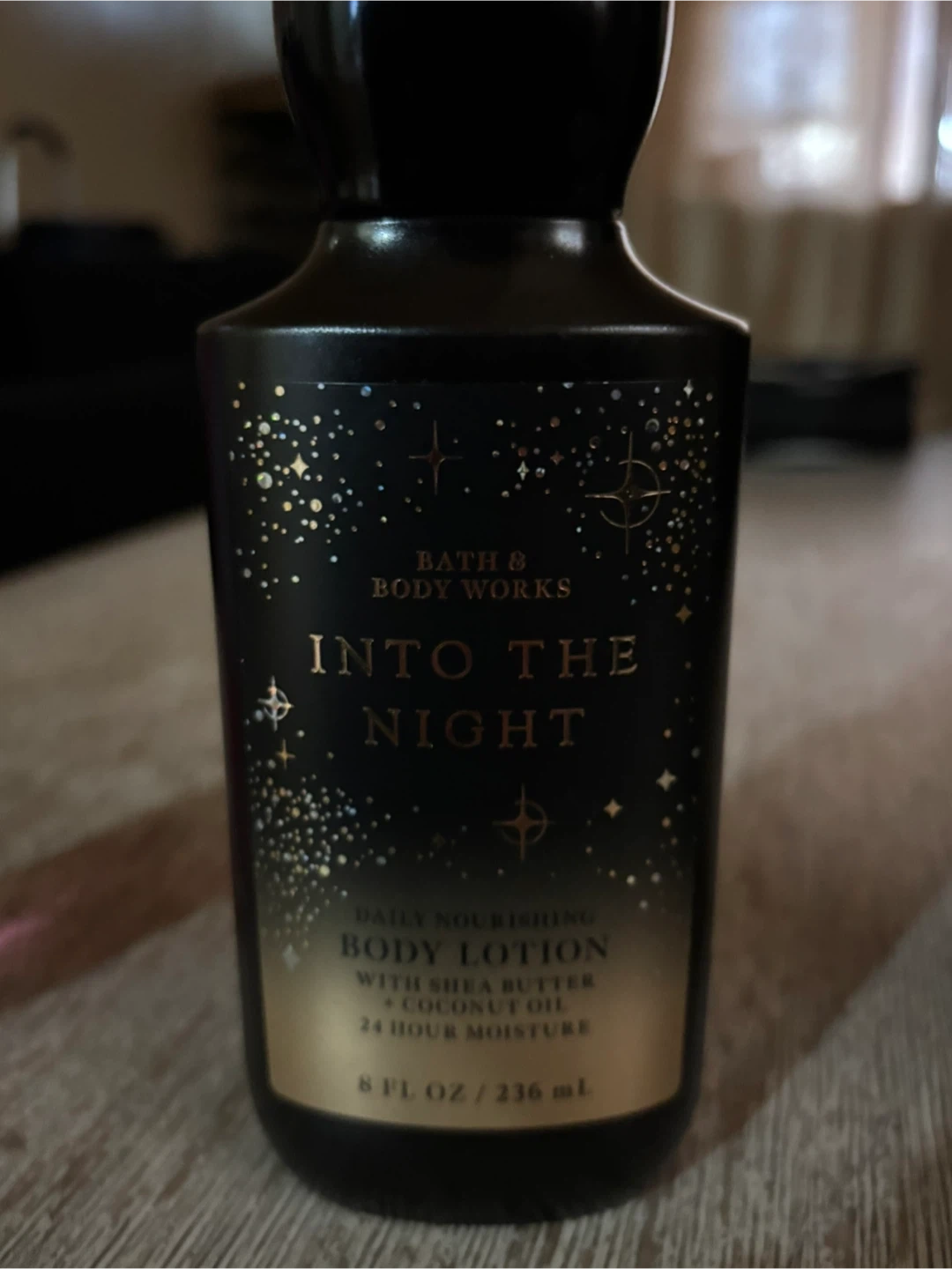 Bath & Body Works Into The Night daily nourishing body lotion. Contains shea butter and coconut oil for 24-hour moisture. 8 fl oz / 236 mL.