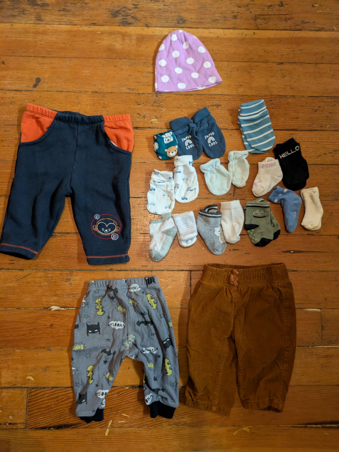 Selling a bundle of baby clothes! This includes a variety of items perfect for a little one. There are several pairs of pants, a cute polka dot hat, socks, and mittens. All in gently used condition and ready for a new home!