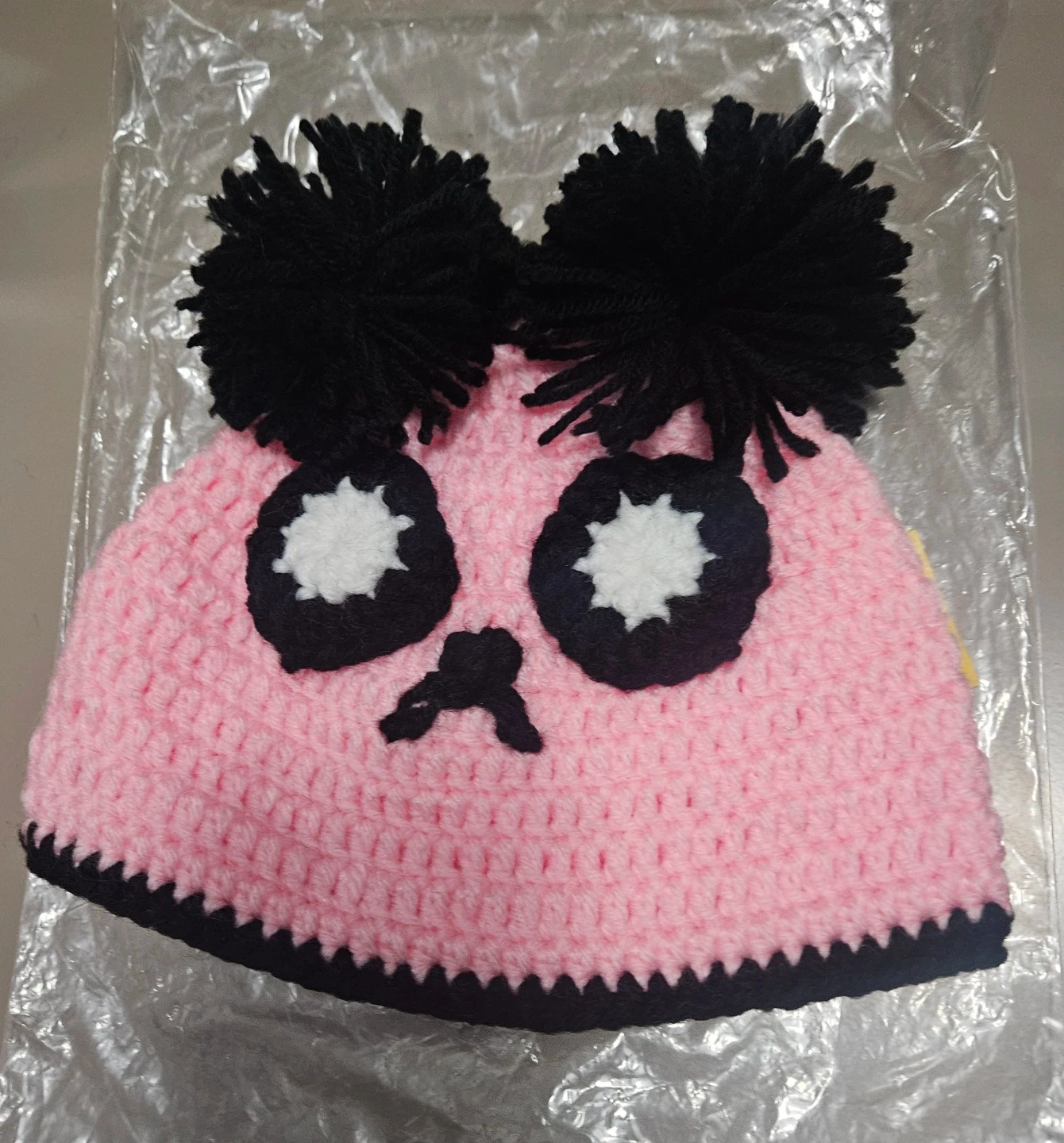 Adorable pink crocheted hat designed to look like a panda face. It features black yarn pom-poms on top and detailed eye and mouth embroidery. The hat has a black trim around the bottom.