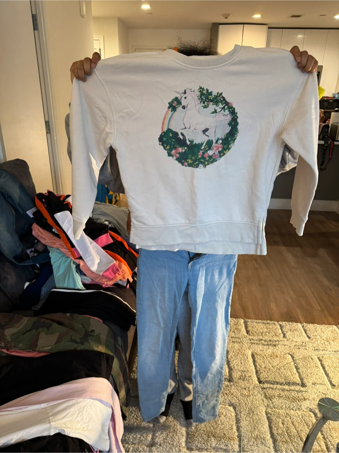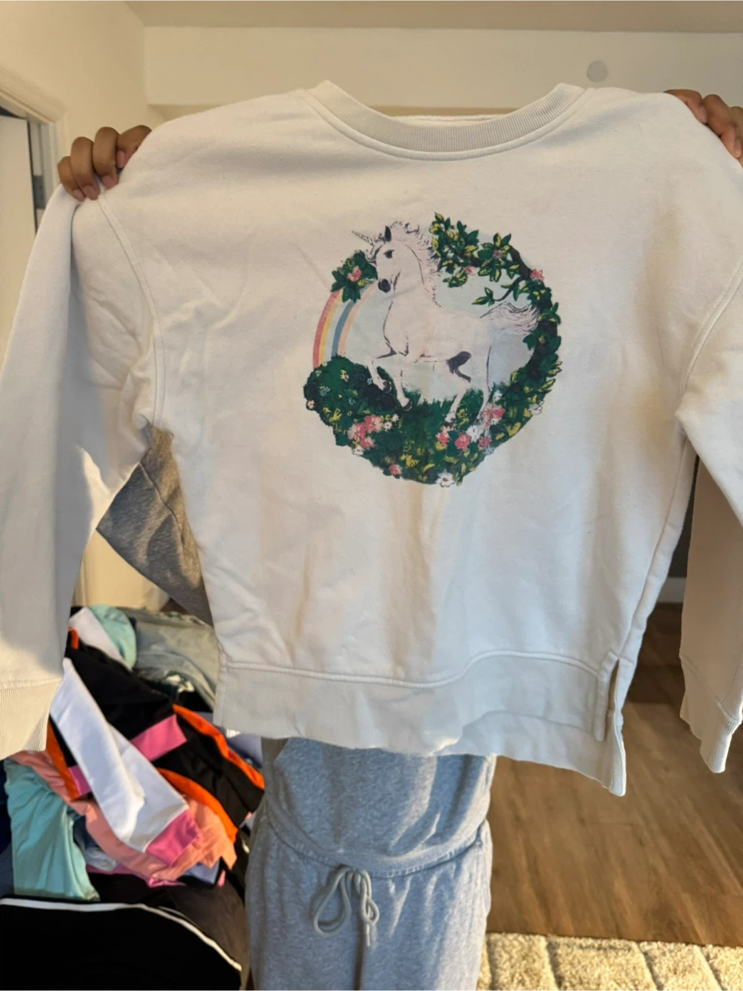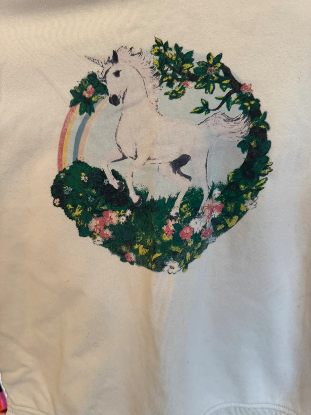 This white sweatshirt features a graphic of a unicorn surrounded by flowers and a rainbow. It's a long-sleeved crewneck with a comfortable fit and soft denim leggings to match Made from a soft fabric blend.Size 16