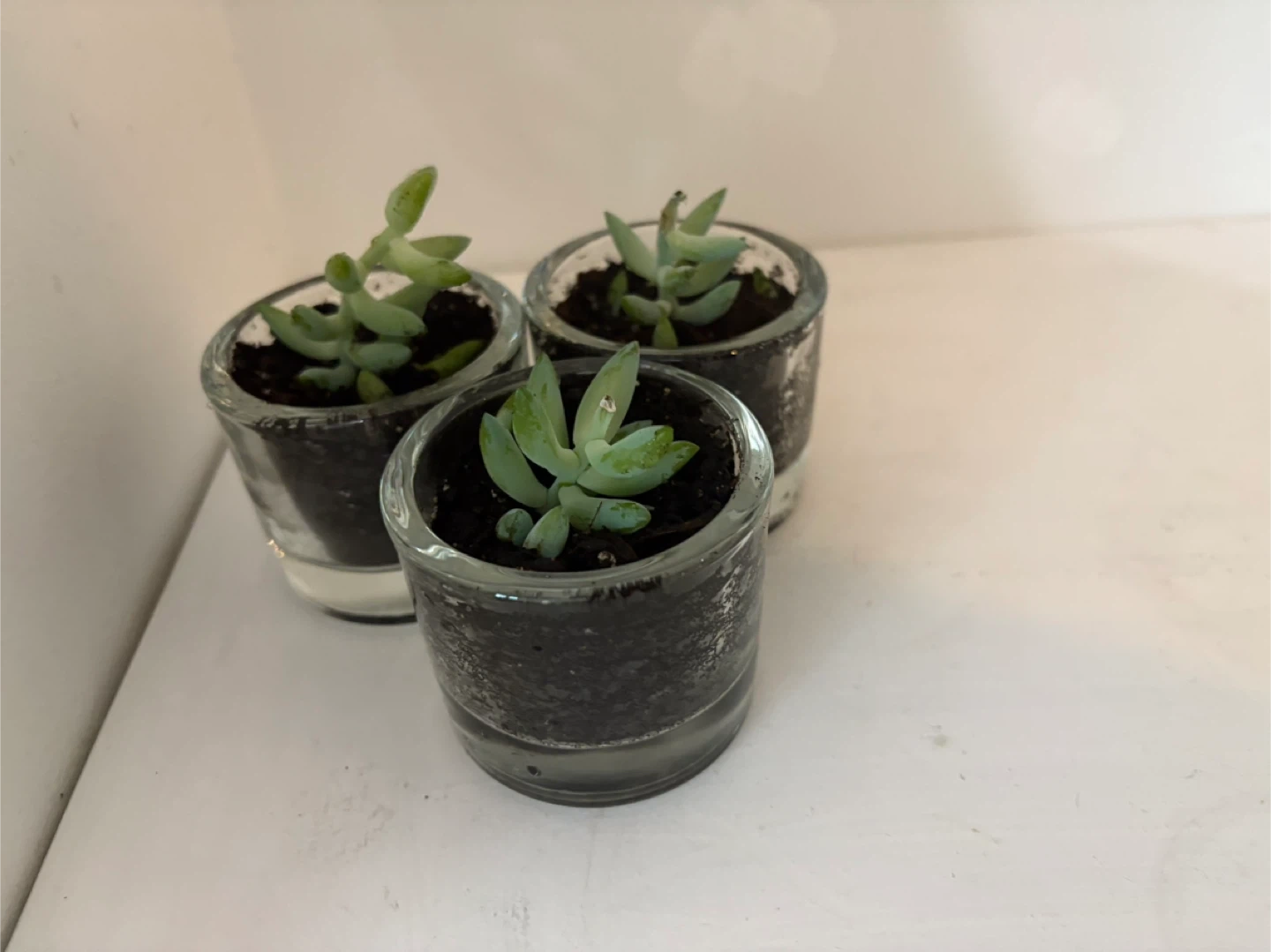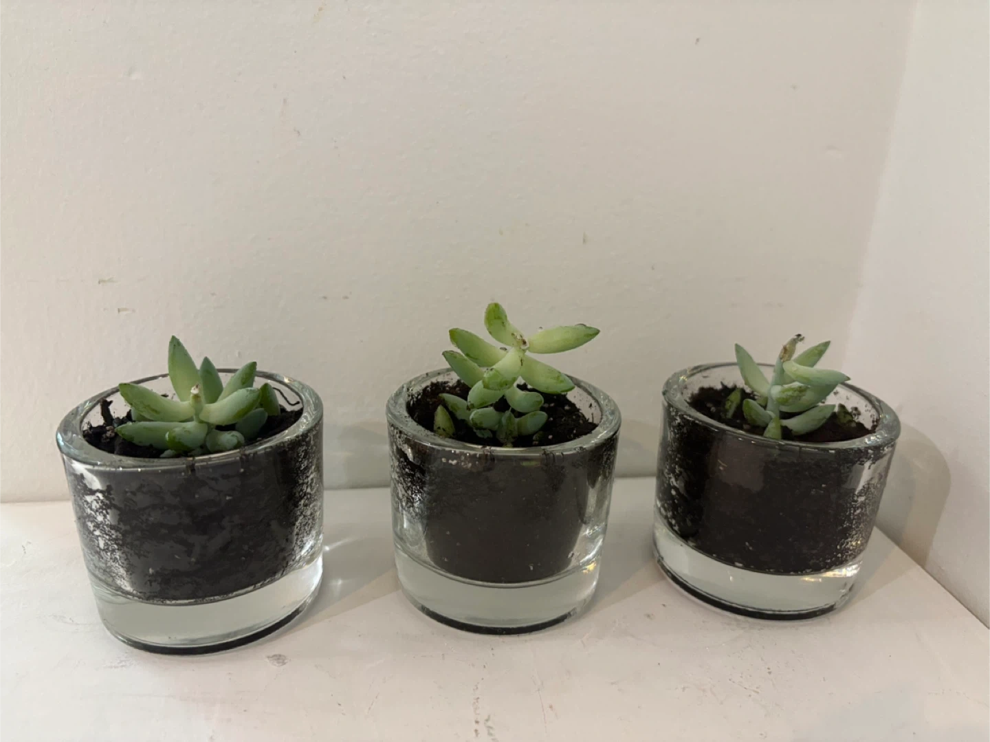 💖Three small succulent plants are potted in clear glass containers. They're ideal for a small indoor garden or as a gift! Each plant is in its own pot with soil.