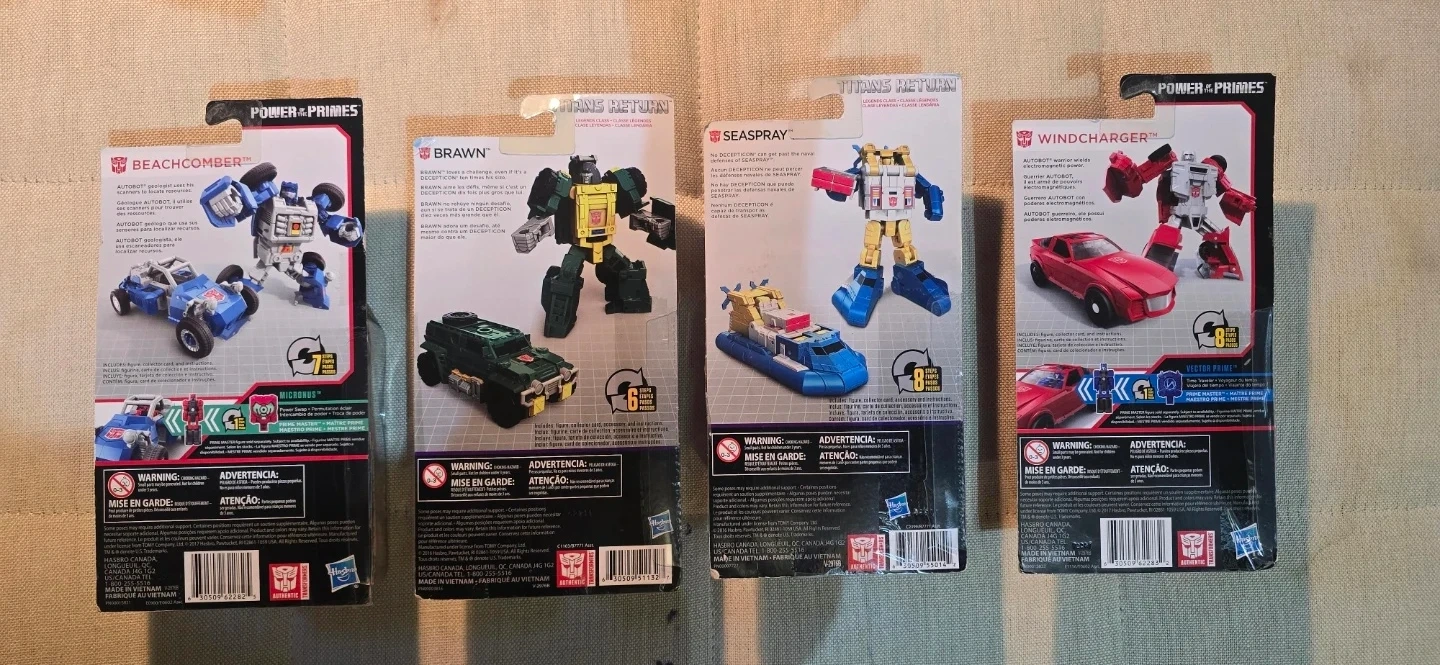 This is a lot of four Transformers action figures: Beachcomber, Brawn, Seaspray, and Windcharger. They're all from the Titans Return and Power of the Primes series. Each figure transforms into a vehicle and comes in its original packaging.