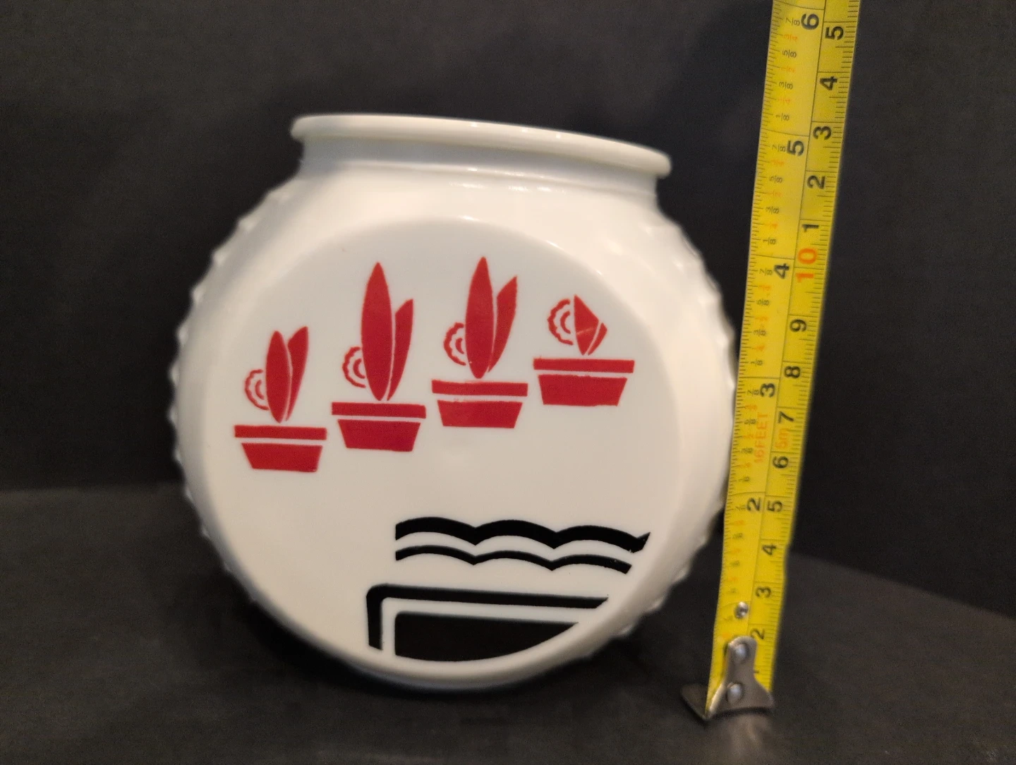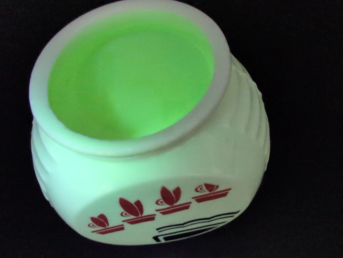 Selling a vintage Fire King Red Flower Pot Art Vitrock Grease Jar (no lid) UV Reactive Uranium Glass. It's in good shape for being almost 80 years old and would make a lovely addition to any vintage collection.