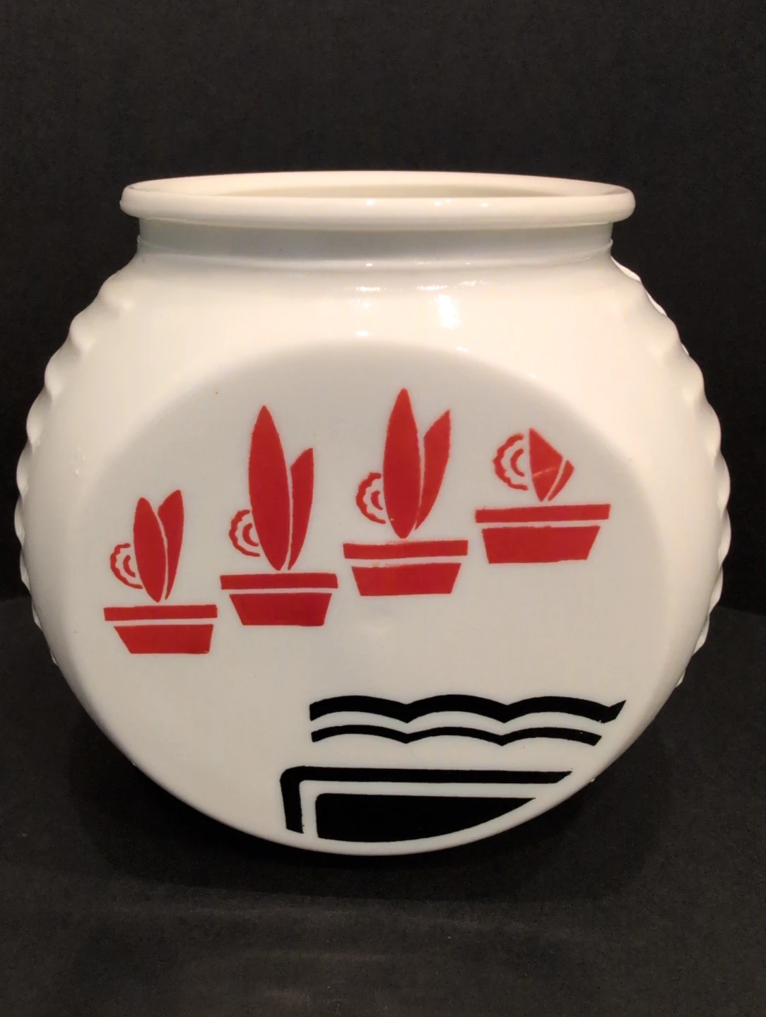 Selling a vintage Fire King Red Flower Pot Art Vitrock Grease Jar (no lid) UV Reactive Uranium Glass. It's in good shape for being almost 80 years old and would make a lovely addition to any vintage collection.