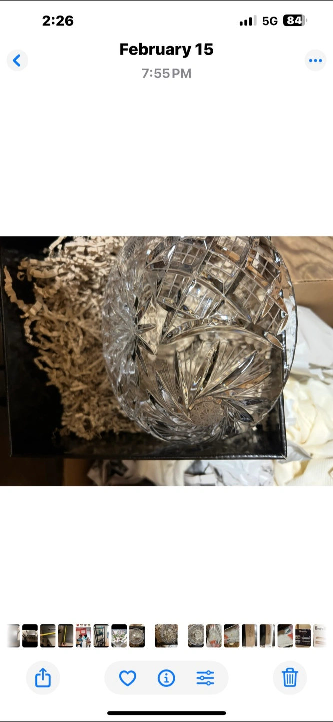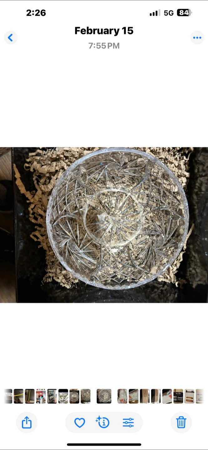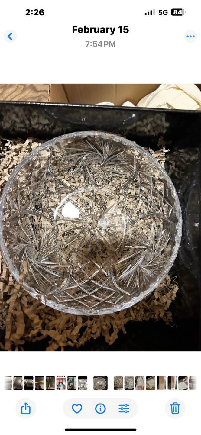 Beautifully detailed crystal cut glass bowl. This piece features intricate starburst patterns and a scalloped edge. Great for serving or as a decorative accent!