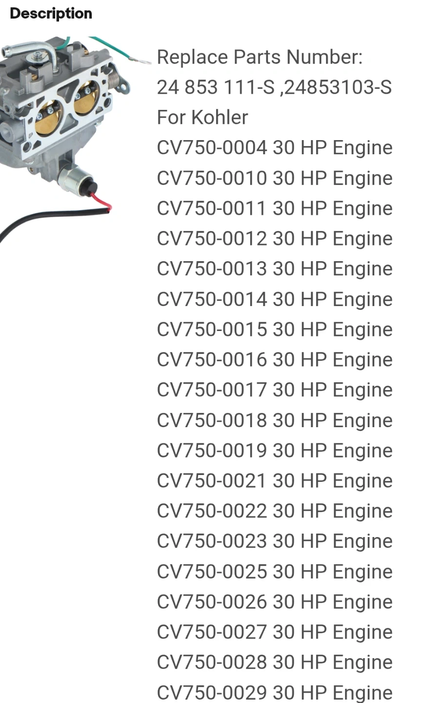 This is a carburetor designed for Kohler 30 HP engines, with replace part numbers 24 853 111-S and 24853103-S. It features a dual-barrel design with metal inlets and electrical connectors.