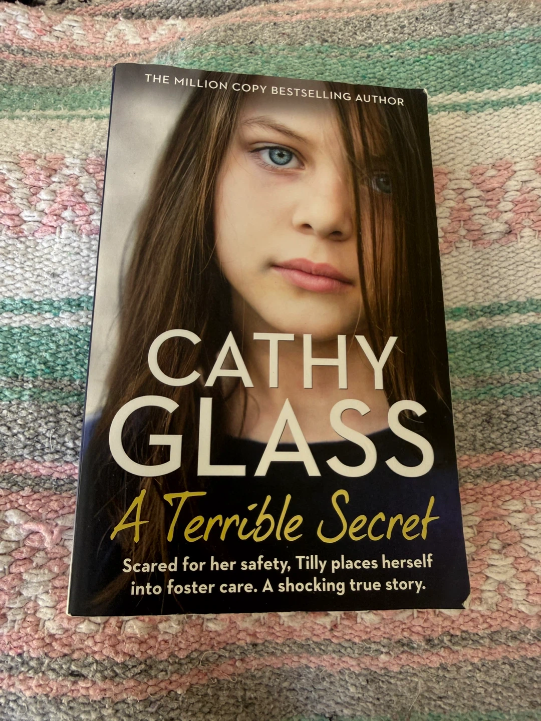 This is the book "A Terrible Secret" by Cathy Glass. It's a shocking true story about a girl named Tilly who goes into foster care. The book is published by HarperCollins.